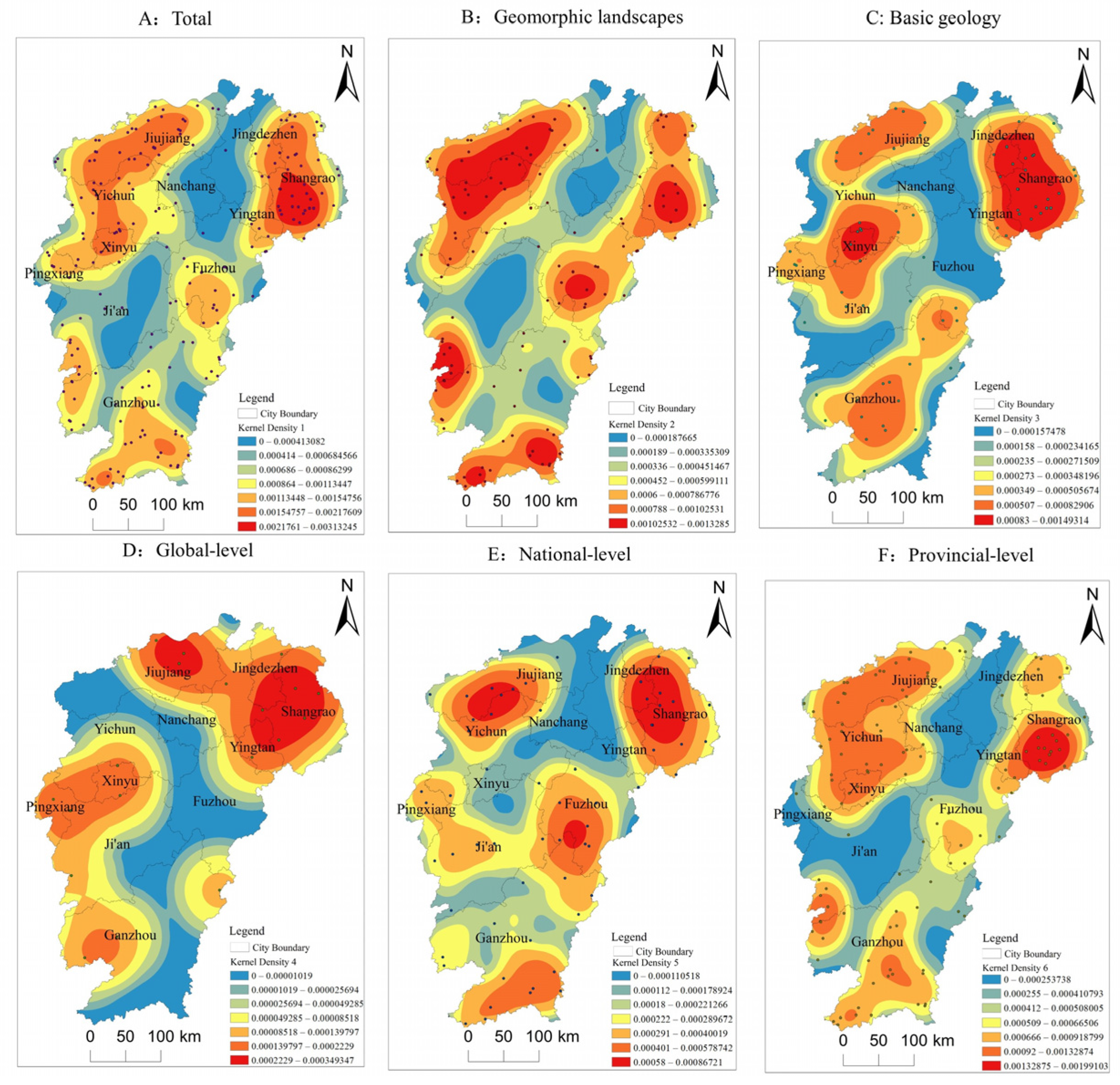 - The geoheritage sites in Jiangxi Province exhibit an overall aggregated distribution pattern.