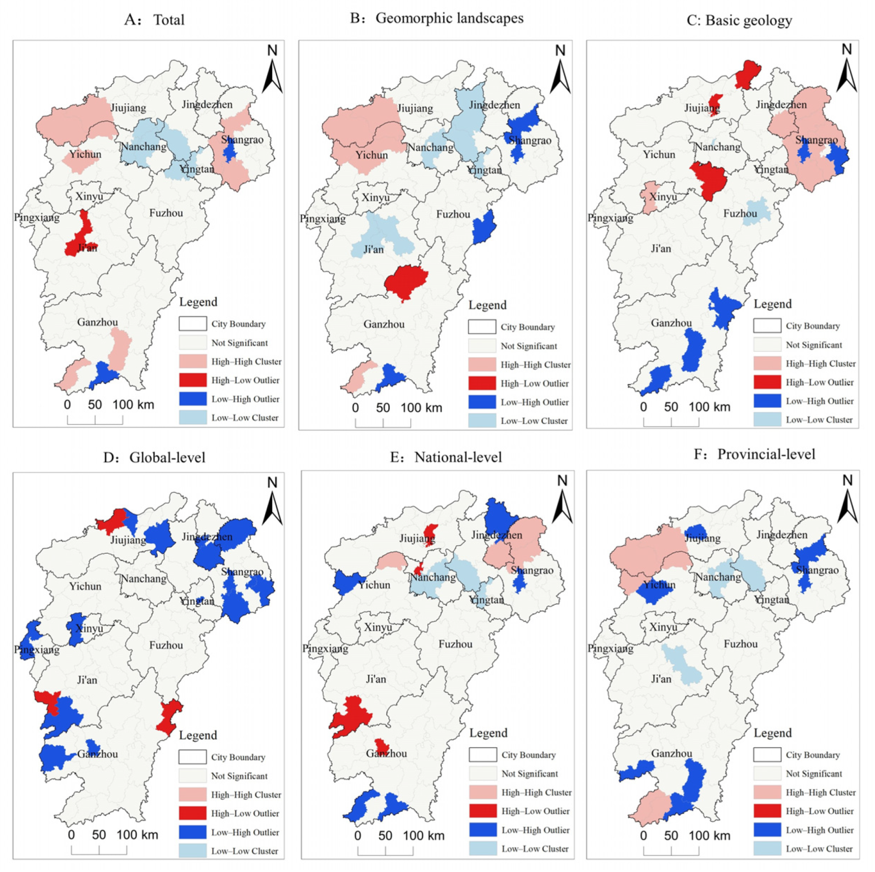 - Global spatial autocorrelation analysis indicates that, with the exception of global-level geoheritage sites, all other geoheritage sites in Jiangxi Province demonstrate significant spatial clustering and exhibit positive spatial correlation.