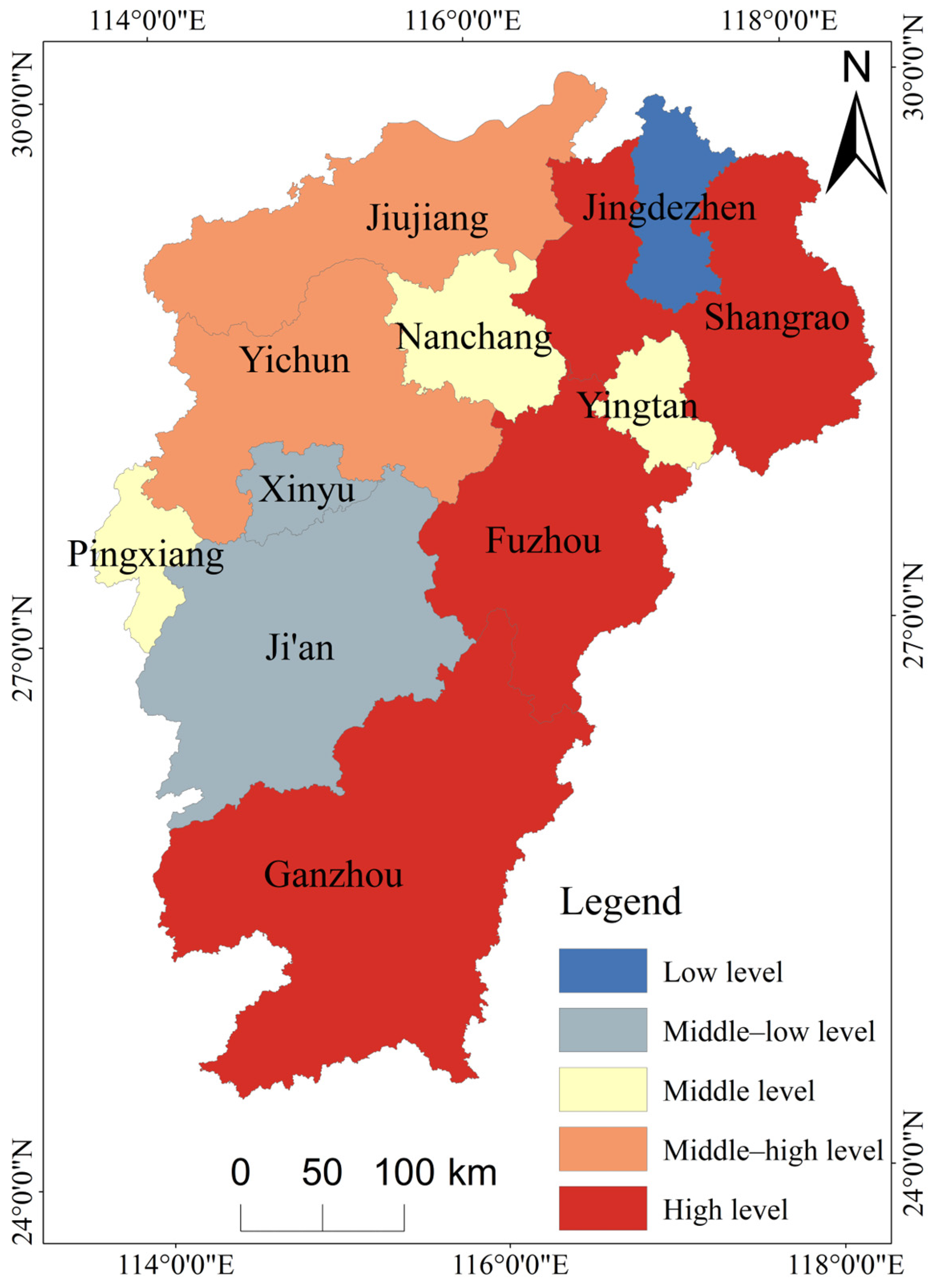 - The overall geotourism development potential of Jiangxi Province is relatively high. Cities with high and relatively high potential account for 45% of the total and are mainly concentrated in the eastern and southern regions, forming contiguous spatial patterns. In contrast, cities with low and relatively low potential represent about 27% of the total, are fewer in number, and display a more scattered distribution.