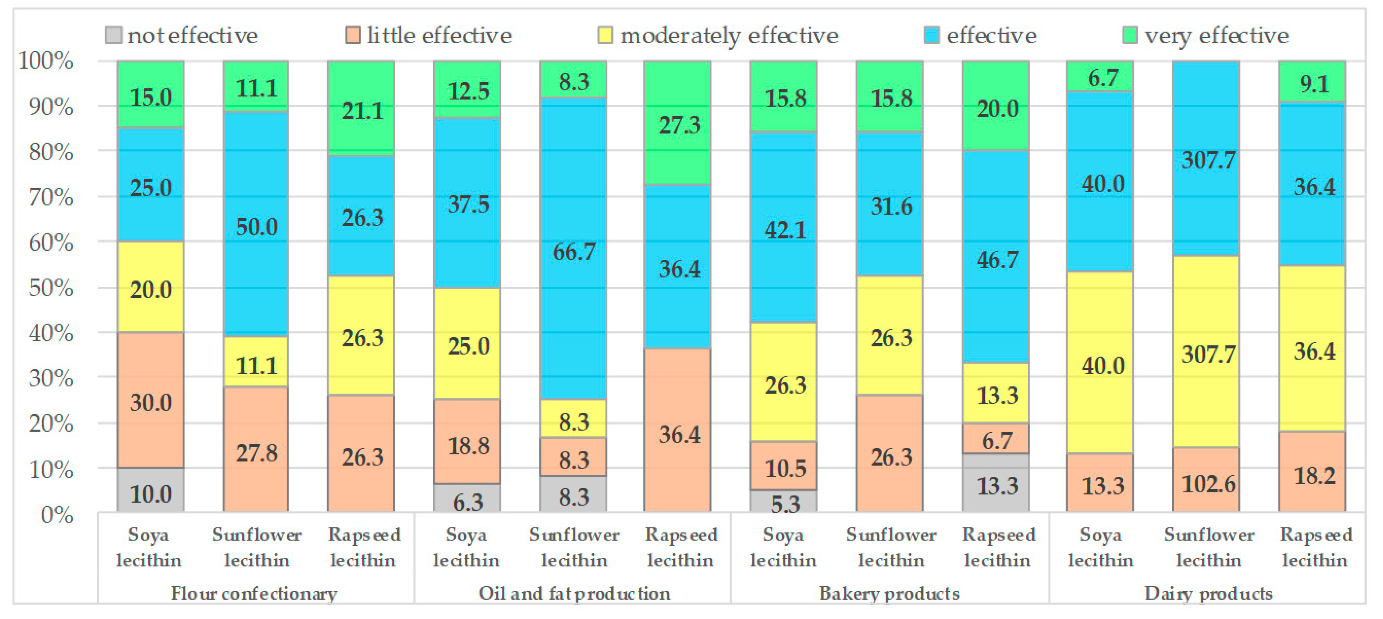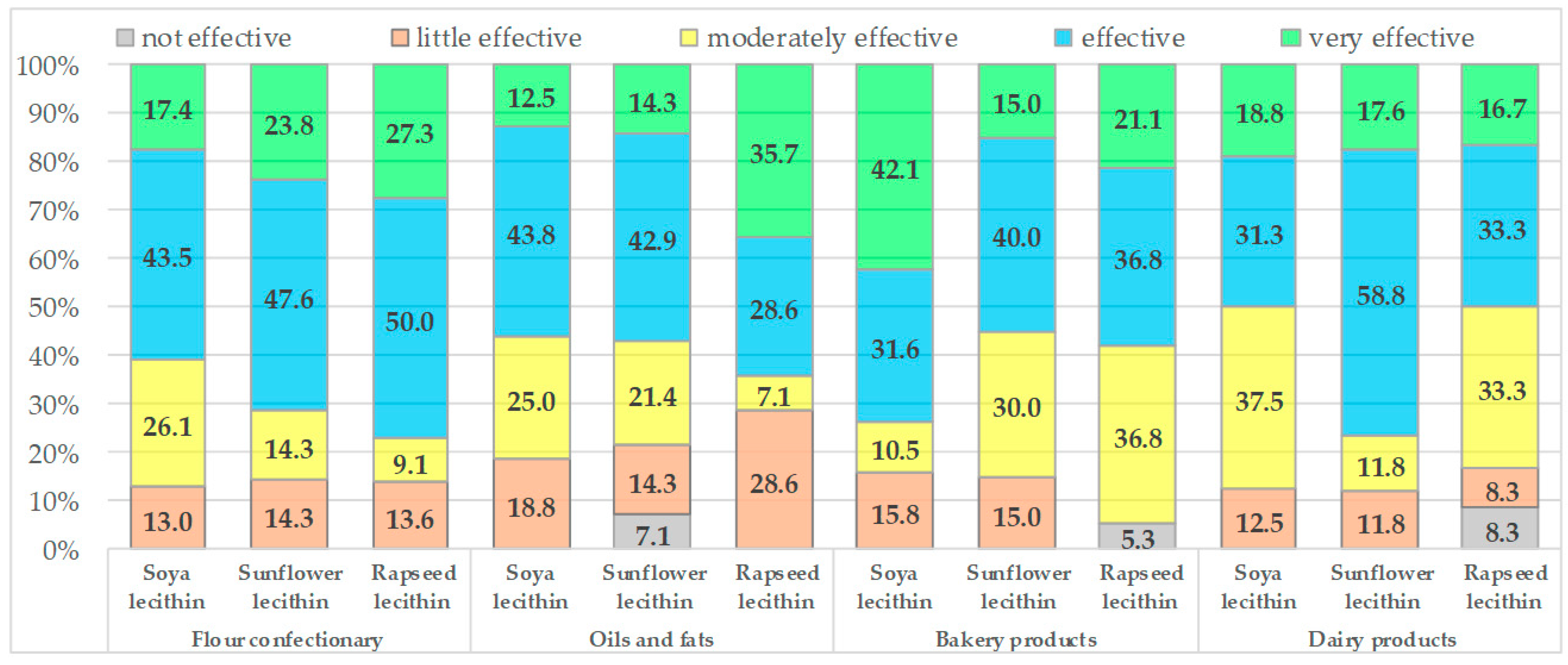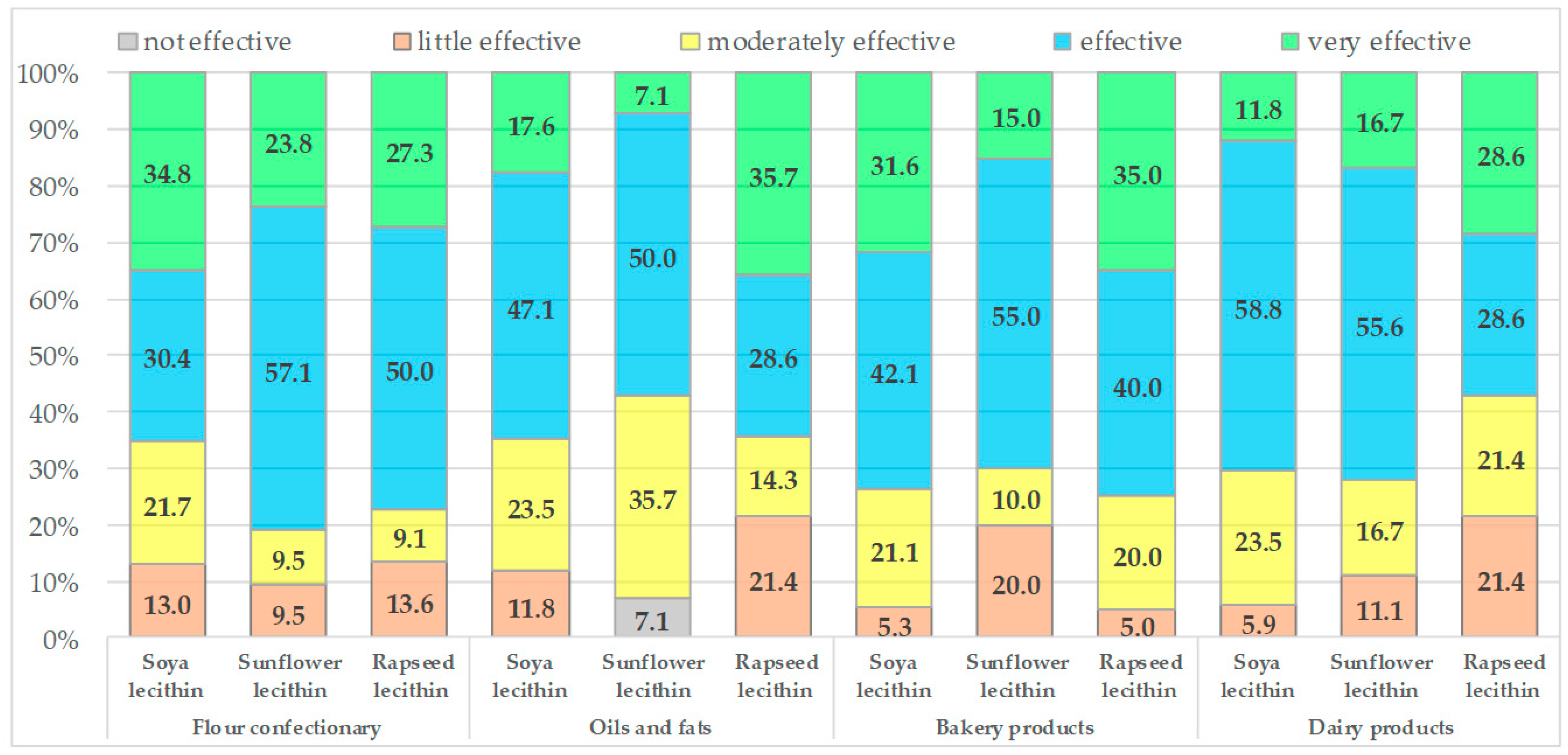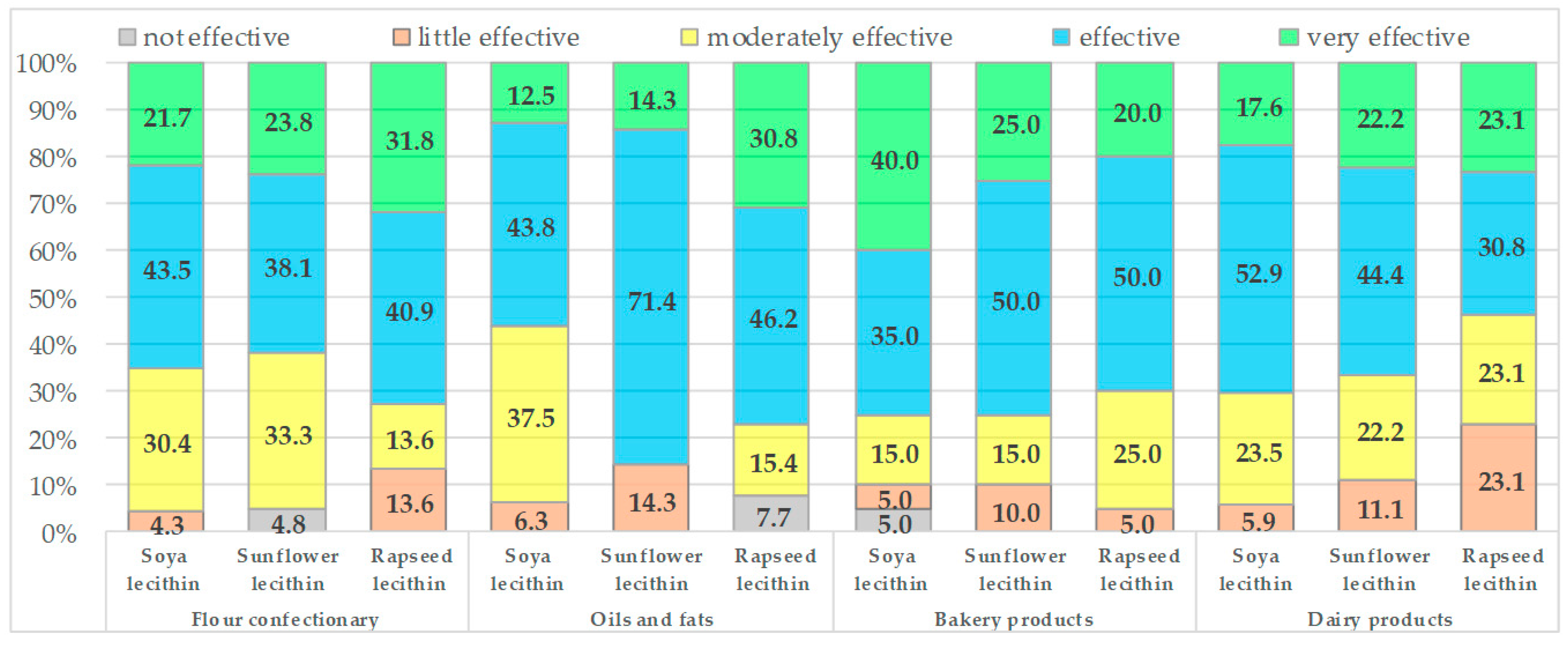 - Sunflower lecithin was given the highest ratings for the production of dairy products and flour confectionery (emulsification, stabilization, other significant technological impacts).