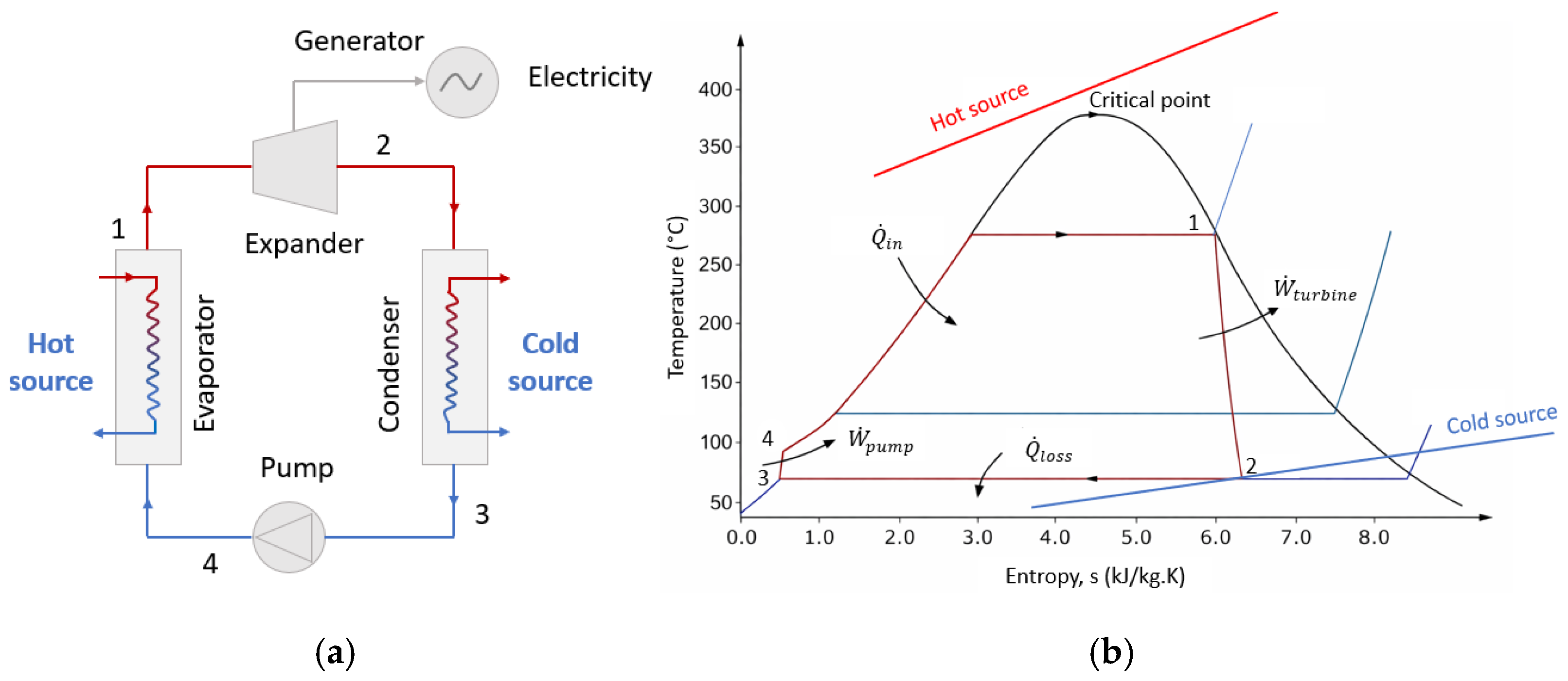 - Heating (Isobaric transformation) (4 → 1): the working fluid is pumped to high pressure and heated at constant pressure within the evaporator until it becomes vapor, using an external heat source such as industrial waste heat or other thermal waste.
