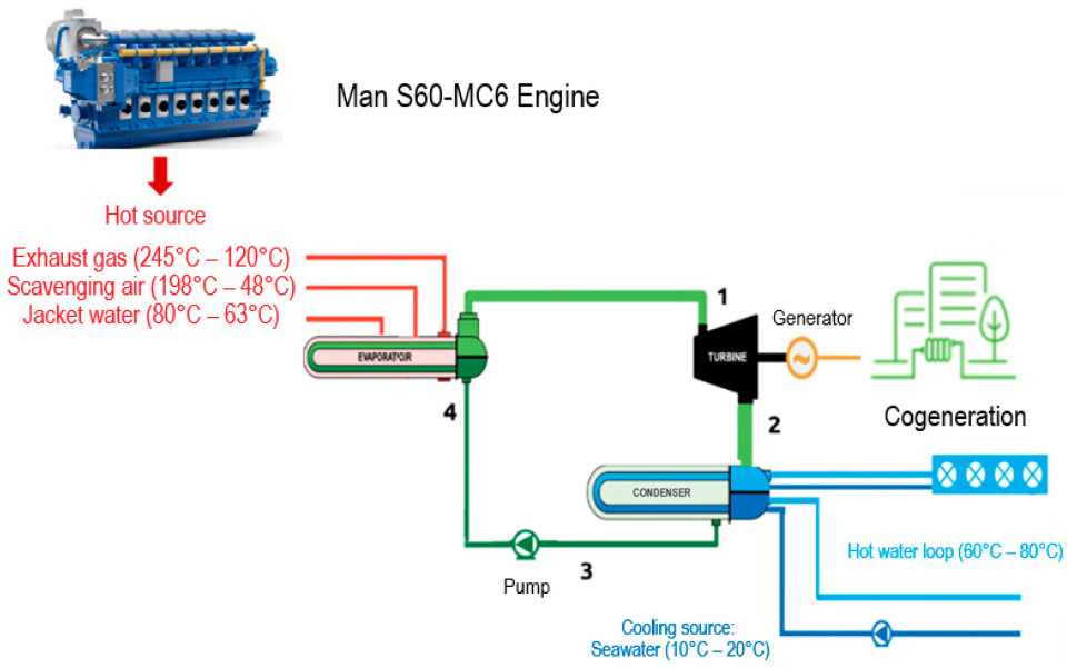 - Miller, T.; Durlik, I.; Kostecka, E.; Kozlovska, P.; Jakubowski, A.; Łobodzińska, A. Waste heat utilization in marine energy systems for enhanced efficiency. Energies 2024, 17, 5653. [Google Scholar] [CrossRef]