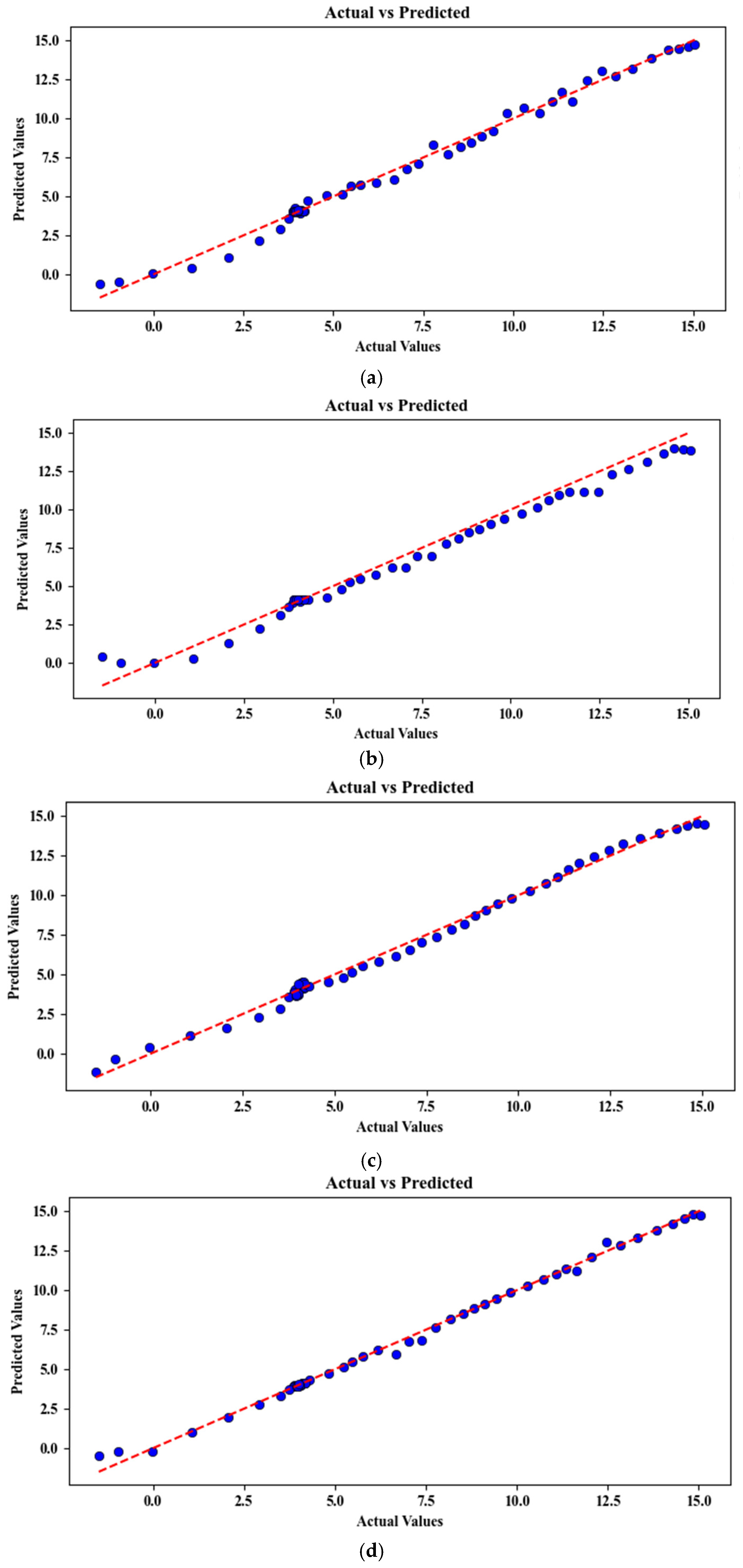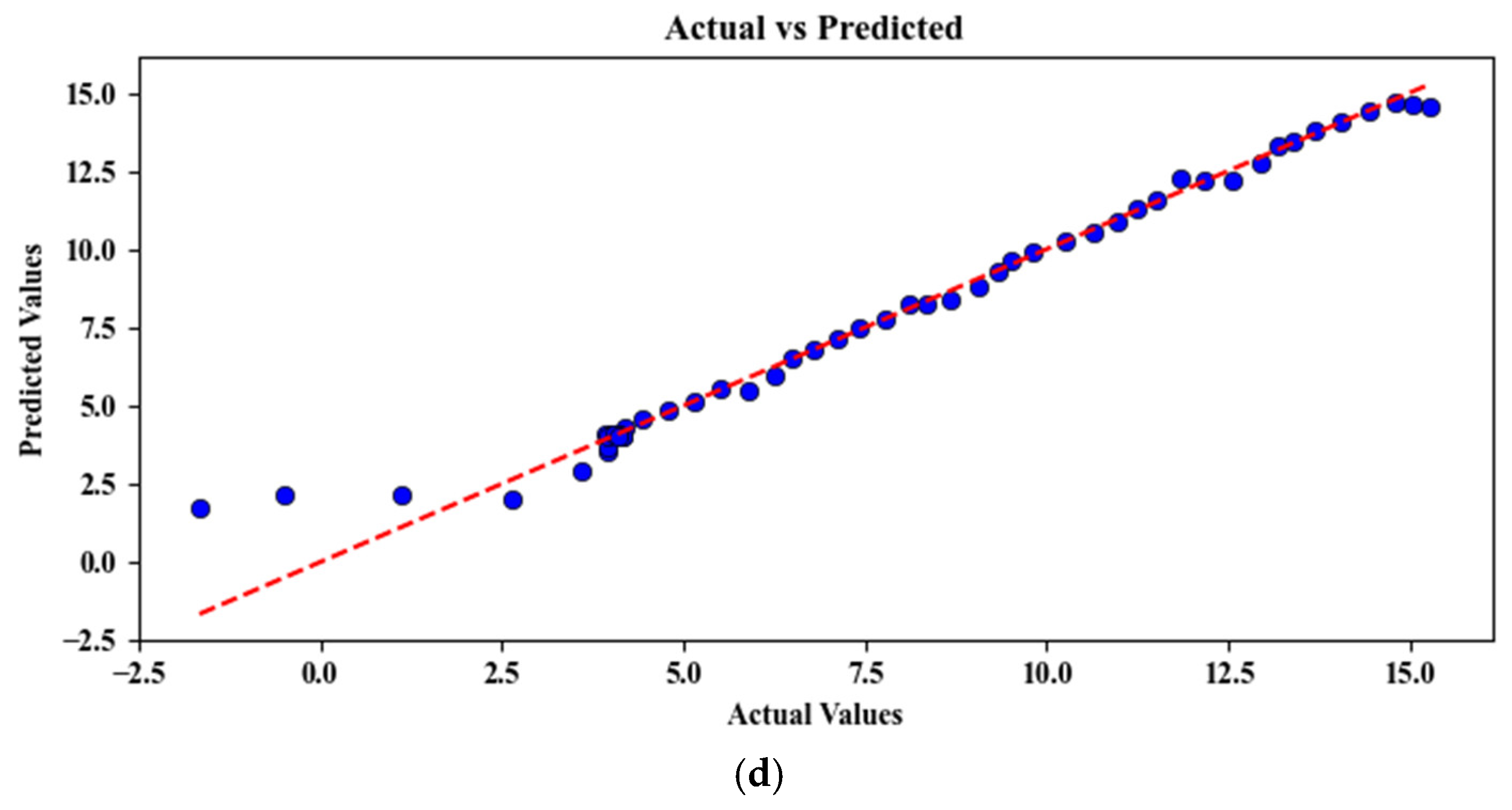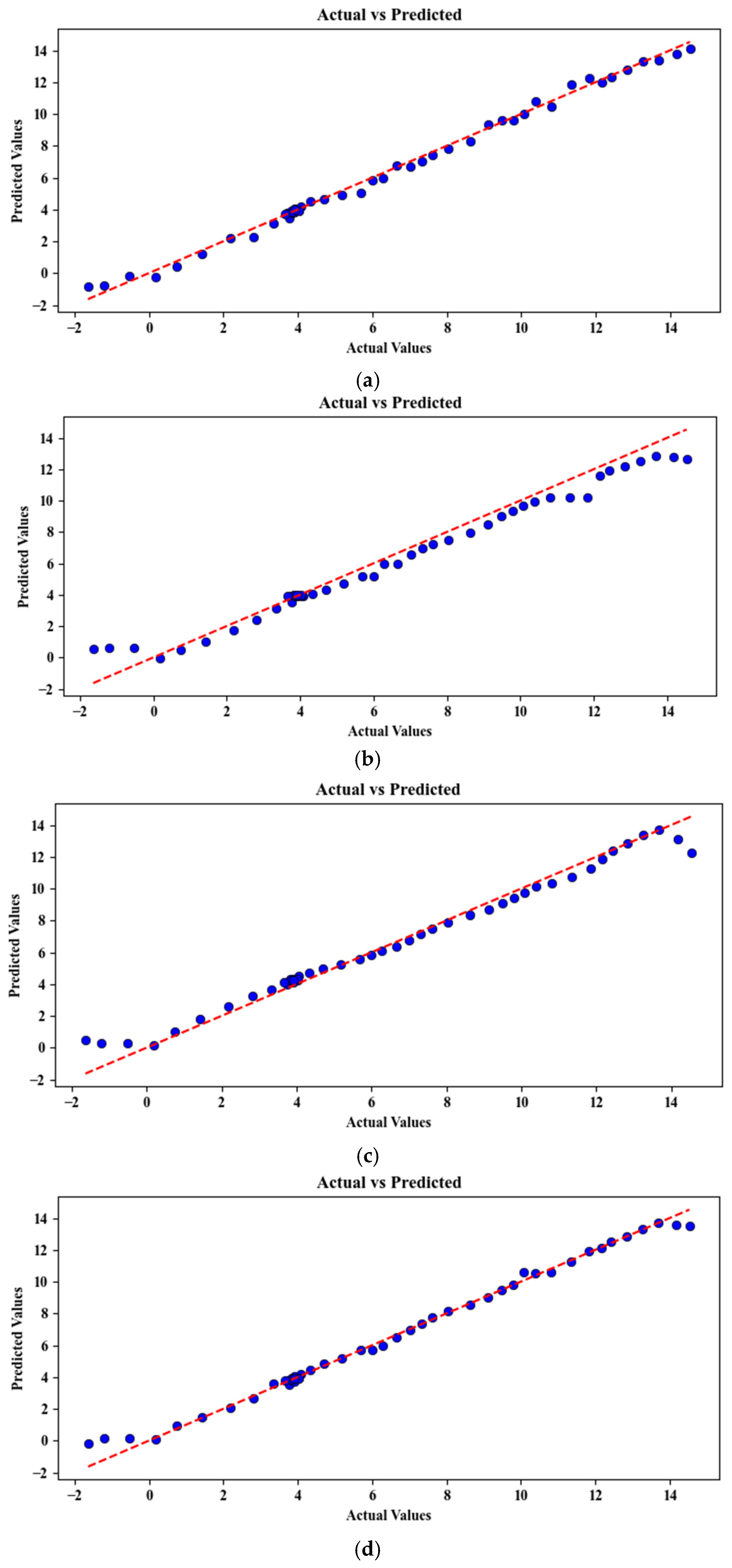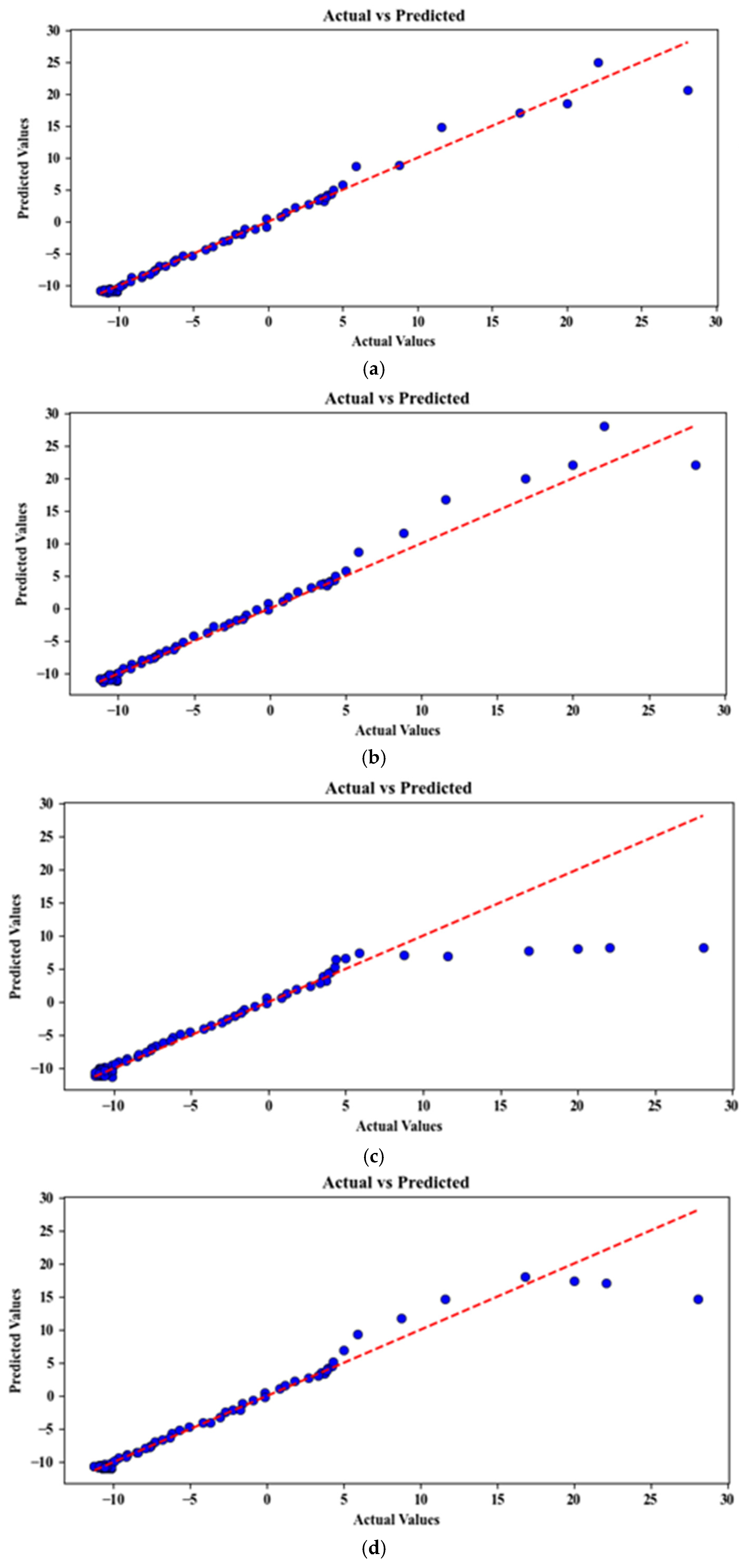 - Random Forest (RF): This employed bootstrap sampling (sampling with replacement) to form several training subsets. Individual trees were trained, and the averaged results of all trees were predicted.