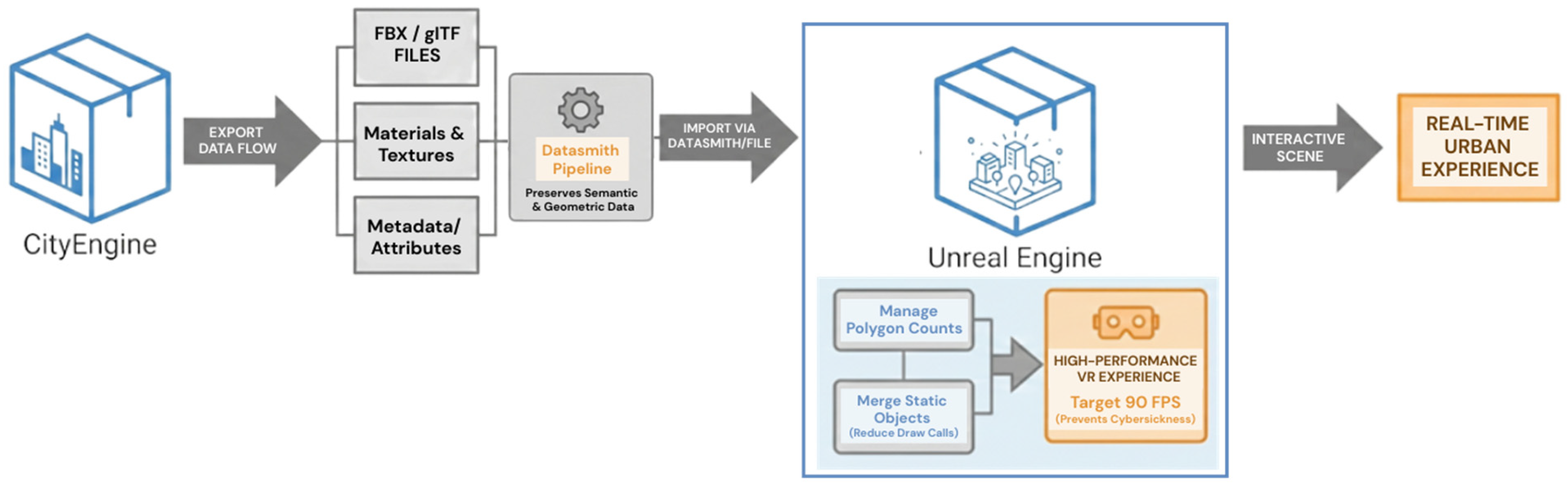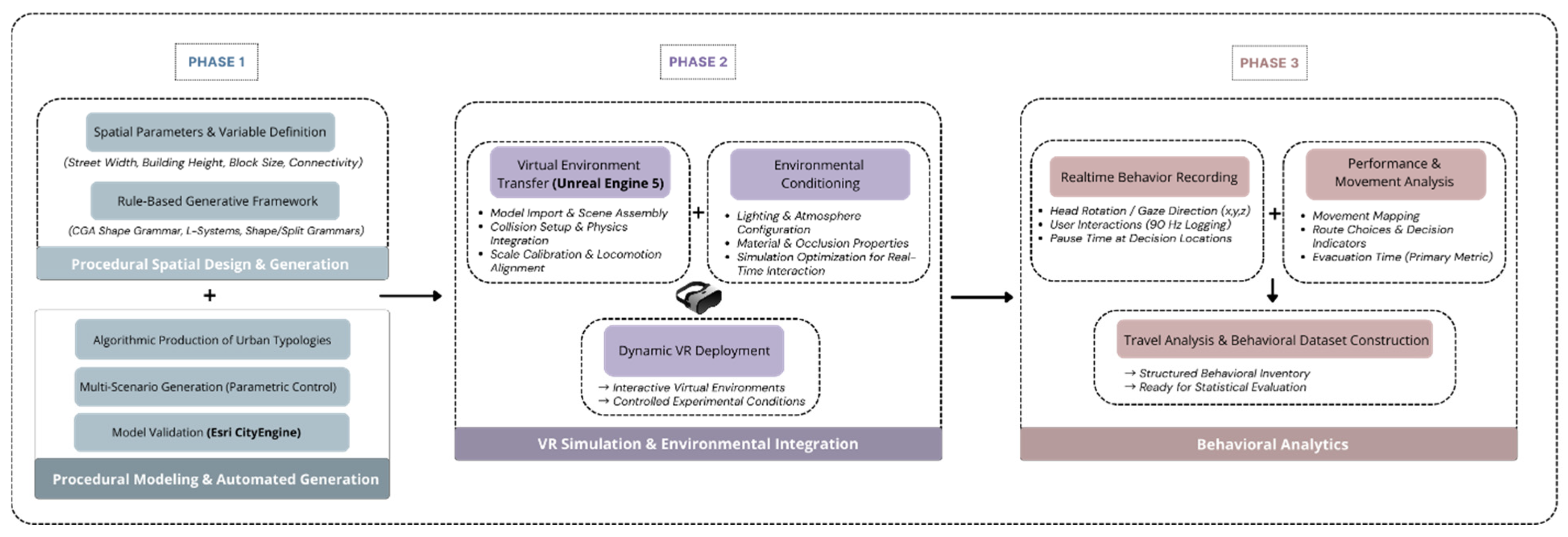 This study presents a methodological synthesis that combines two technologies: procedural environment generation and immersive VR. Procedural generation allows for the rule-based creation of diverse urban forms without relying on site-specific data. At the same time, VR serves as a “behavioral wind tunnel” [7], a controlled environment where human performance can be tested under psychologically meaningful stress [16]. Procedural generation functions as a morphological engine capable of producing an unlimited variety of urban configurations. Together, these methods support a calibration paradigm that moves beyond context-specific assumptions to develop a generalizable and empirically grounded understanding of human behavior.