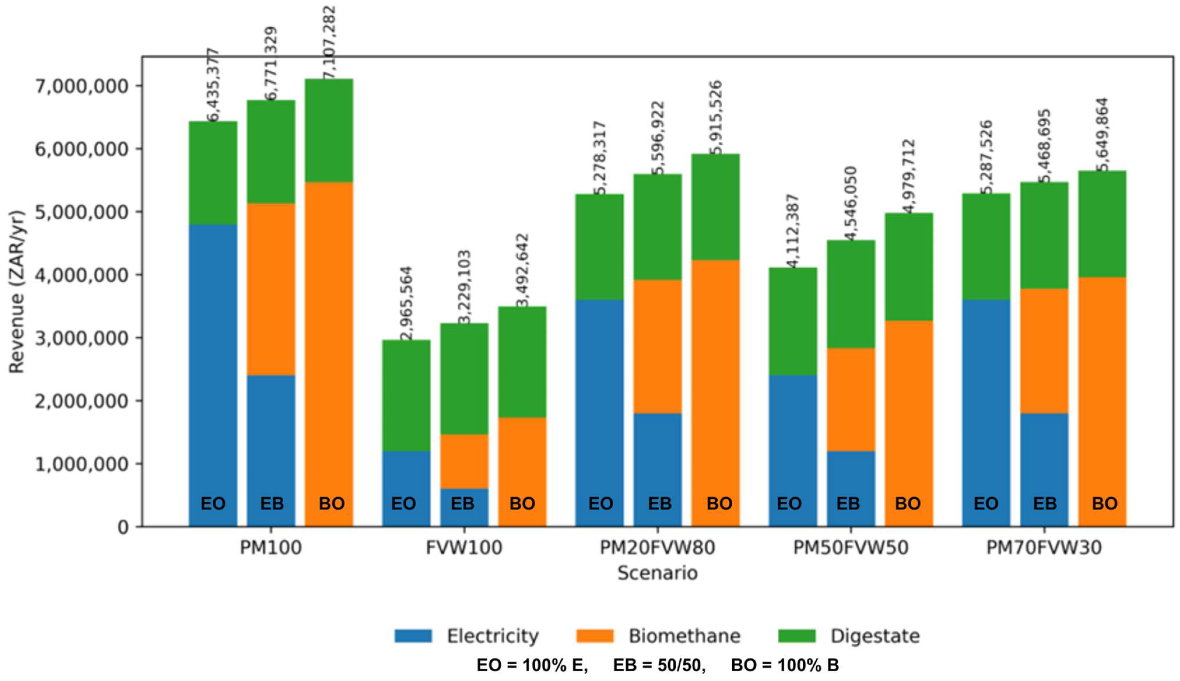Figure 3. This stacks product revenues by route. Within each blend, 100% biomethane is greater than 50/50, and 50/50 is also greater than 100% electricity because the biomethane sales price exceeds the electricity tariff. The uplift from electricity to biomethane is 7–22% across blends (largest at PM50–FVW50). Across blends, totals scale with methane output (PM-rich mixes highest, FVW100 lowest). Digestate revenue is invariant to routing within a blend (same mass produced) and contributes a material 20–30% of the top line, providing a stabilizing second stream. Bars include product revenues only (electricity, biomethane, digestate). The gate-fee (500 ZAR t