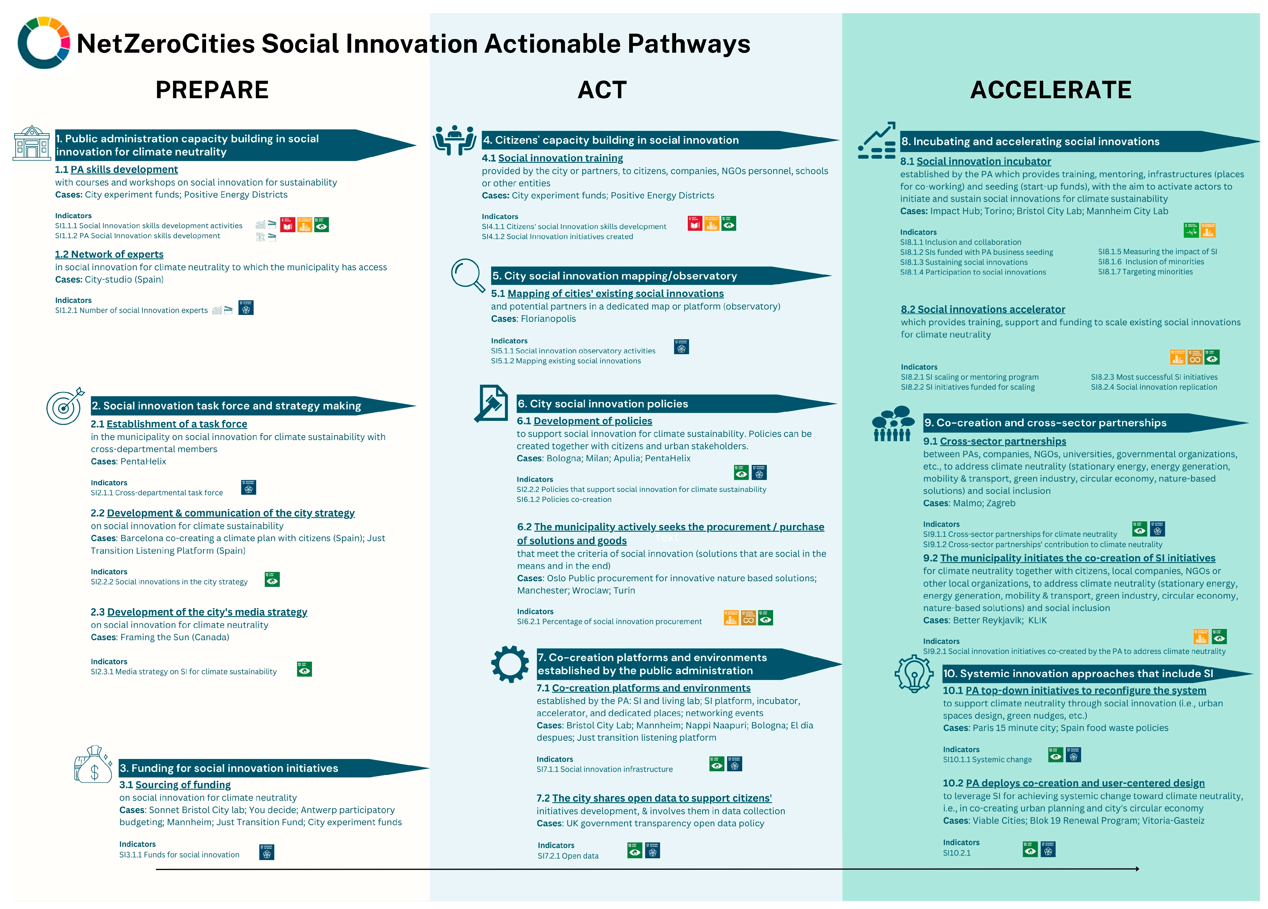 By identifying and analysing 445 climate actions designed by 53 municipalities participating in the pilot programme of the NetZeroCities project, the study provides a comprehensive overview of the most frequently selected social innovation categories, in relation to geographical contexts and the emission domains of actions that cities are focused on. More specifically, it provides timely evidence on municipalities’ design, implementation, and scaling strategies of social innovation as a key lever for enabling a systemic approach to climate neutrality.