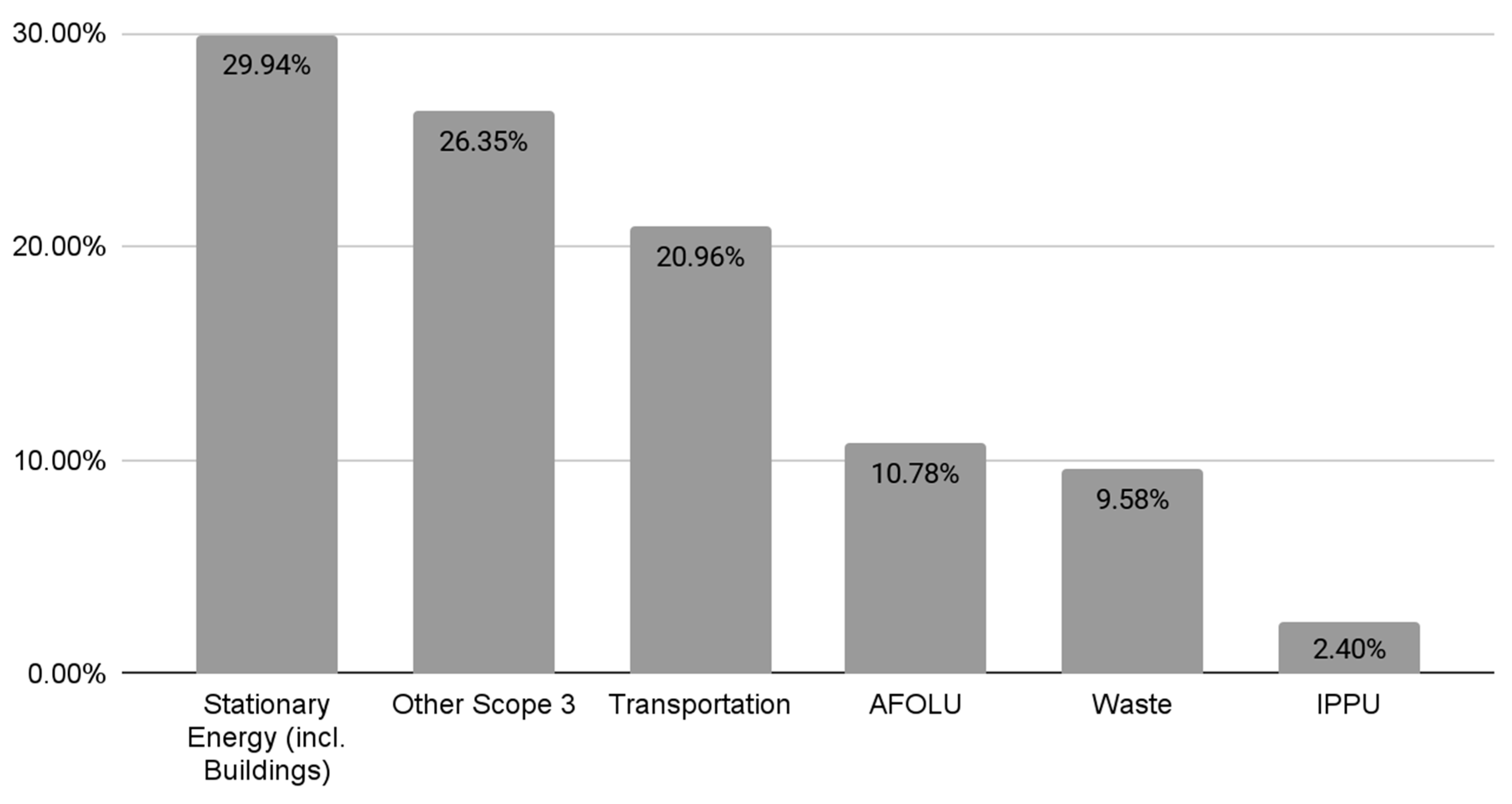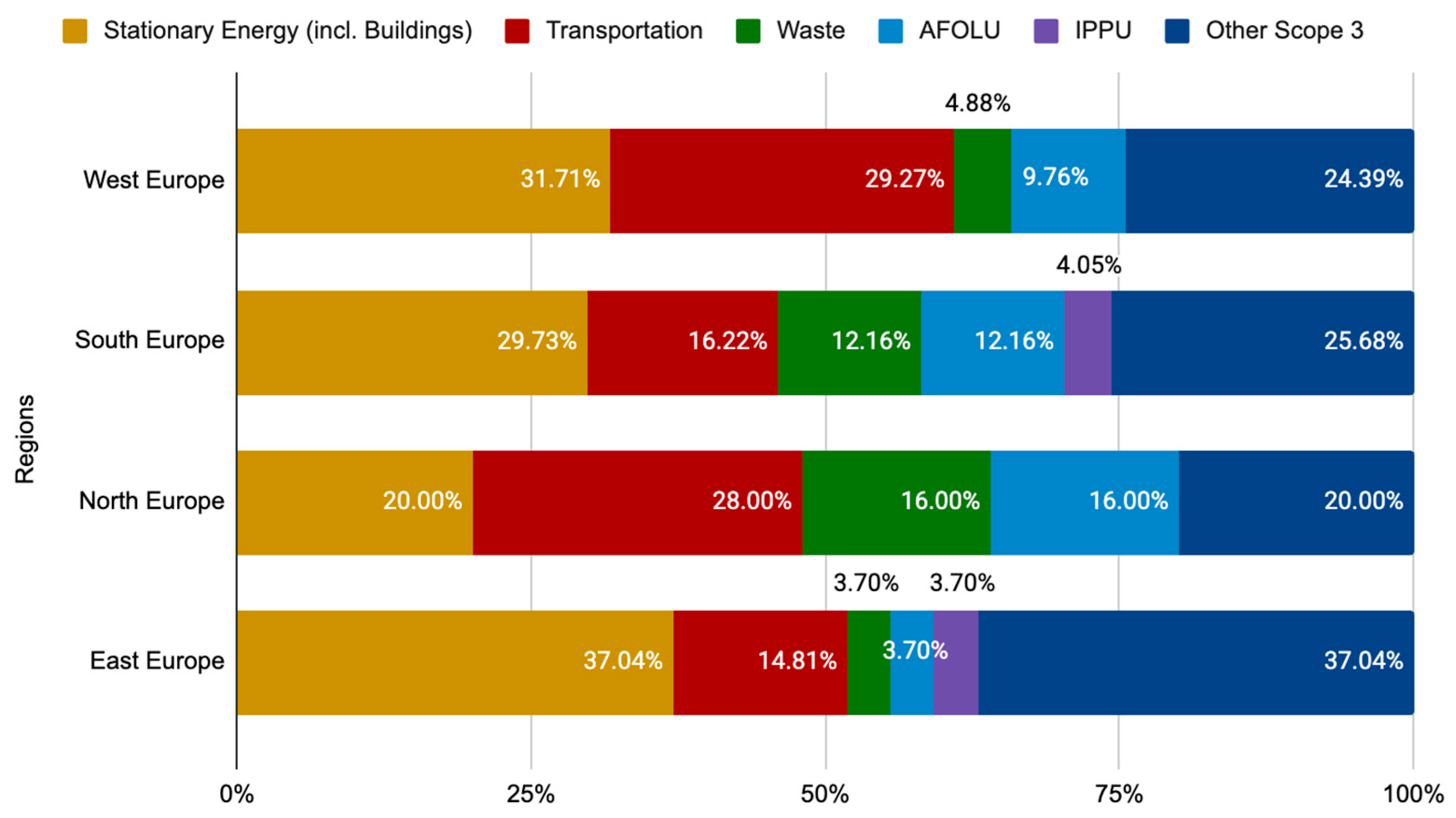 Figure 4). Transportation represents 20.96% of all selections and appears strongly in Northern and Western Europe, though less elsewhere, suggesting regional differences in mobility infrastructure and policy emphasis. The remaining domains, including waste, IPPU, and AFOLU, are comparatively minor, with IPPU at only 2.4%, indicating limited relevance for urban-level climate action. These emerging patterns show that cities across Europe prioritise emission domains where socio-technical and behavioural factors are especially influential, namely stationary energy use, consumption patterns, and transport.