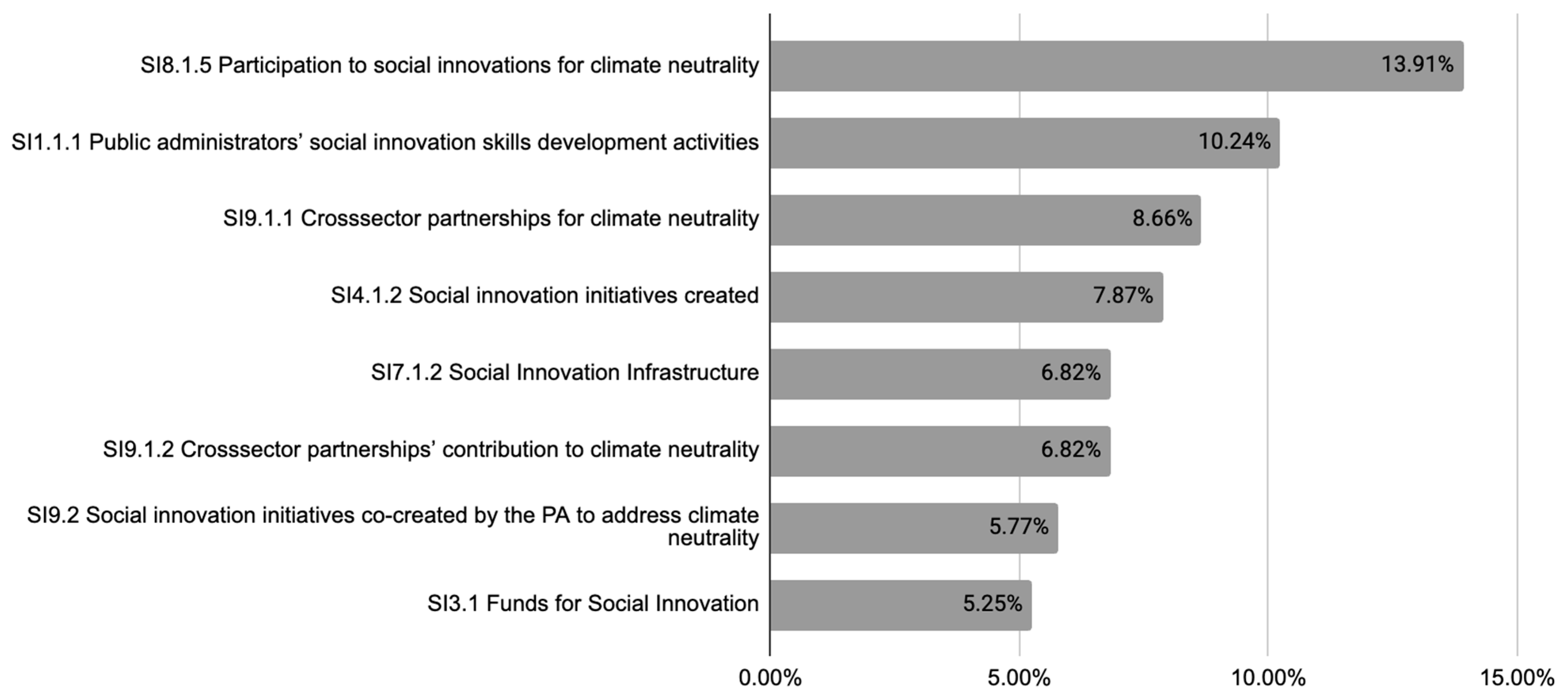 It is also observed that the indicator SI8.1.5, “Participation in social innovations for climate neutrality”, has the highest occurrence at 13.91% (corresponding to 106 climate actions). This indicator corresponds to category 8, “Incubating and accelerating social innovations for climate neutrality”, which is also the highest occurring category. However, SI1.1.1, “Public administrators’ social innovation skills development activities”, accounts for 10.24% (78 climate actions), making it the second most occurring indicator, while its corresponding category is 1, “Public administration capacity building in social innovation”, which has a total of 82 occurrences and only ranks fourth among the highest selected categories (