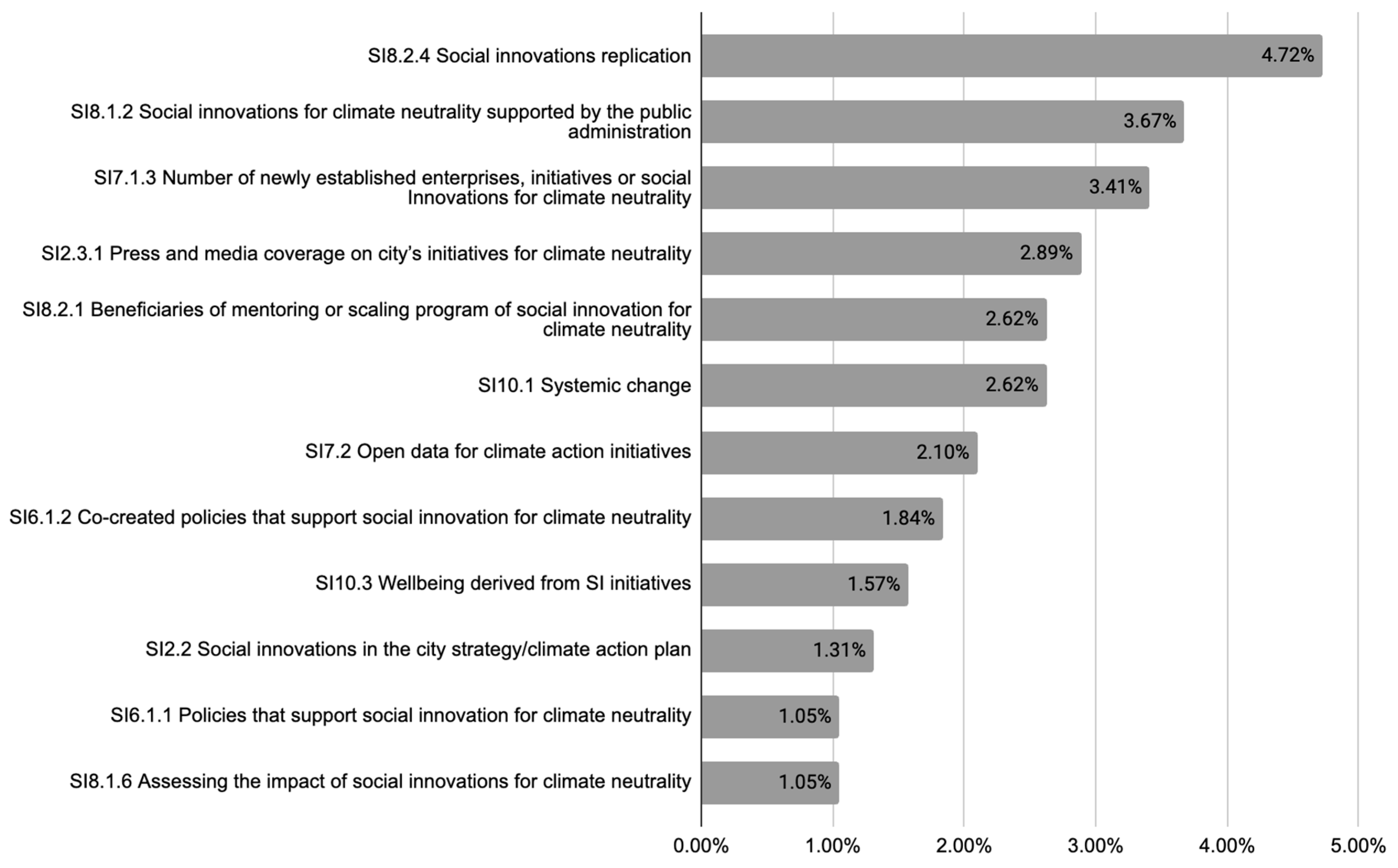 Figure 6). Categories within this grouping include SI8.1.2, “Social innovations for climate neutrality supported by the public administration”, and SI8.2.4, “Social innovations replication”, at 3.67% and 4.72%, respectively. This finding is aligned with category 8 being the highest occurring category. SI7.1.3, “Number of newly established enterprises, initiatives or social innovations for climate neutrality”, occurs at 3.41% or across 26 actions, significantly contributing to the overall popularity of category 7, “Co-creation platforms and environments”. In addition, indicators associated with category 6, “Social innovation policies”, and category 10, “Systemic innovation approaches which include social innovation”, show a medium frequency, specifically with SI6.1.1 (Policies that support social innovation for climate neutrality), SI6.1.2 (Co-created policies that support social innovation for climate neutrality), SI10.1 (Systemic change), and SI10.3 (Well-being derived from SI initiatives). Although overall, these categories are less frequent among cities, as seen in