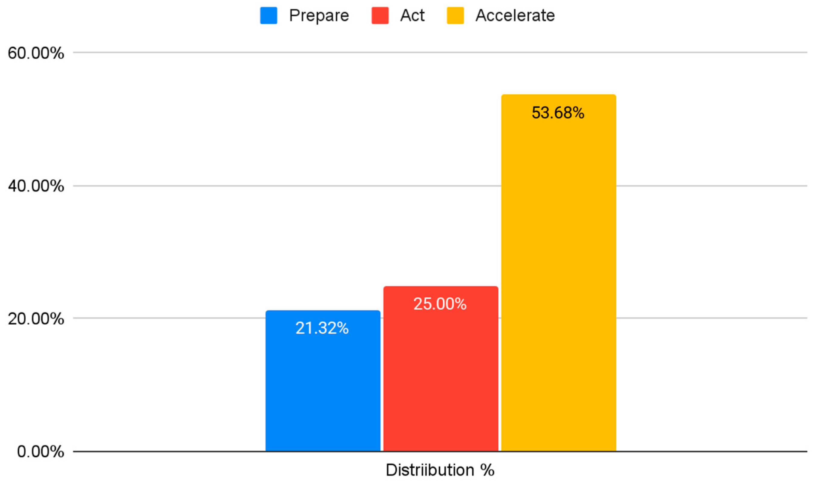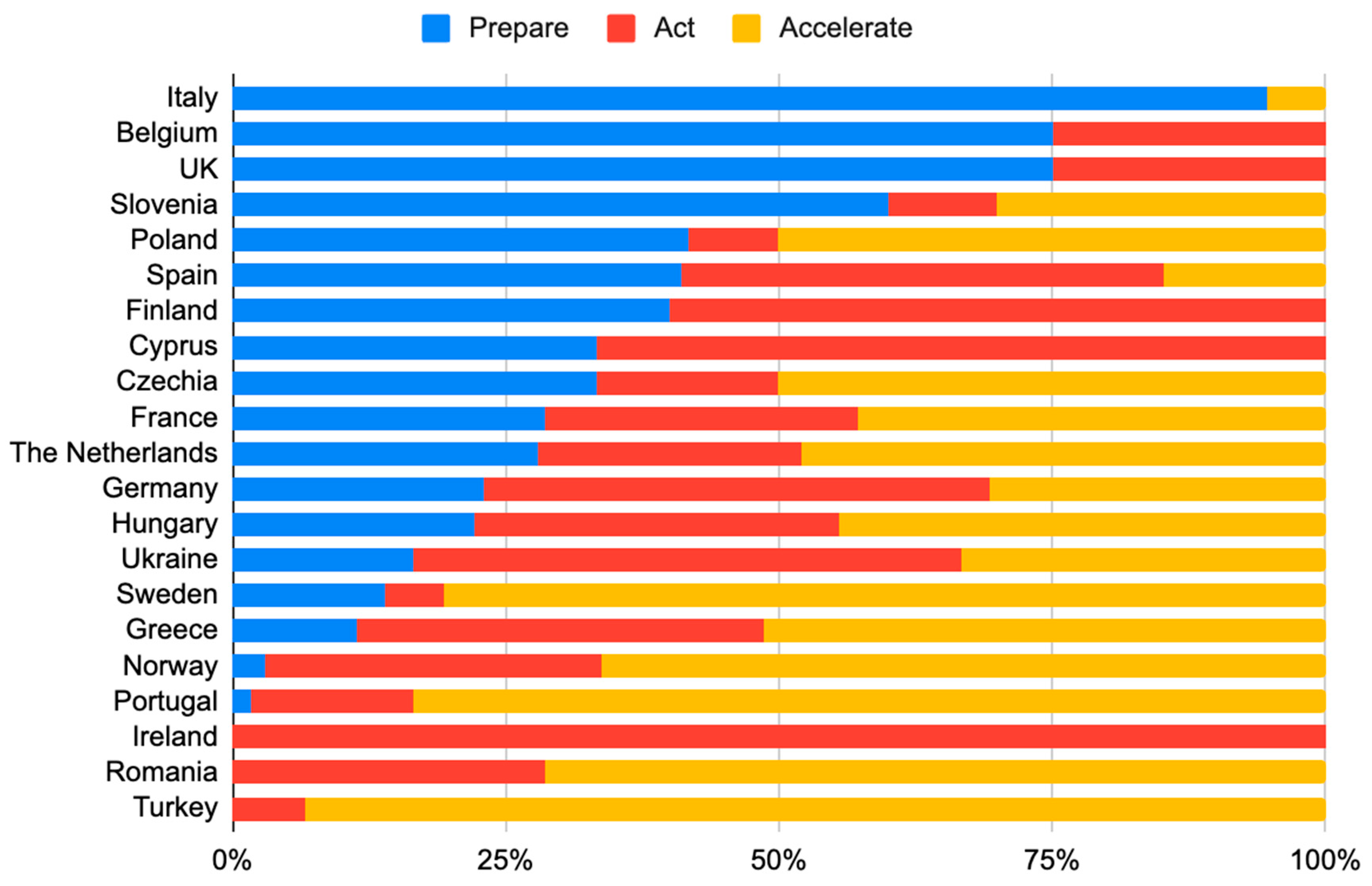 A smaller number of countries demonstrate a more balanced distribution of actions across the three phases, combining preparatory actions, participatory mechanisms, and scaling strategies. These include France (28.57% Prepare, 28.57% Act, 42.86% Accelerate), followed by Germany (23.08% Prepare, 46.15% Act, 30.77% Accelerate), Hungary (22.22% Prepare, 33.33% Act, 44.44% Accelerate), the Netherlands (28% Prepare, 24% Act, 48% Accelerate), Czechia (33.33% Prepare, 16.67% Act, 50% Accelerate), Spain (41.18% Prepare, 44.12% Act, 14.71% Accelerate), and Ukraine (16.67% Prepare, 50% Act, 33.33% Accelerate).
