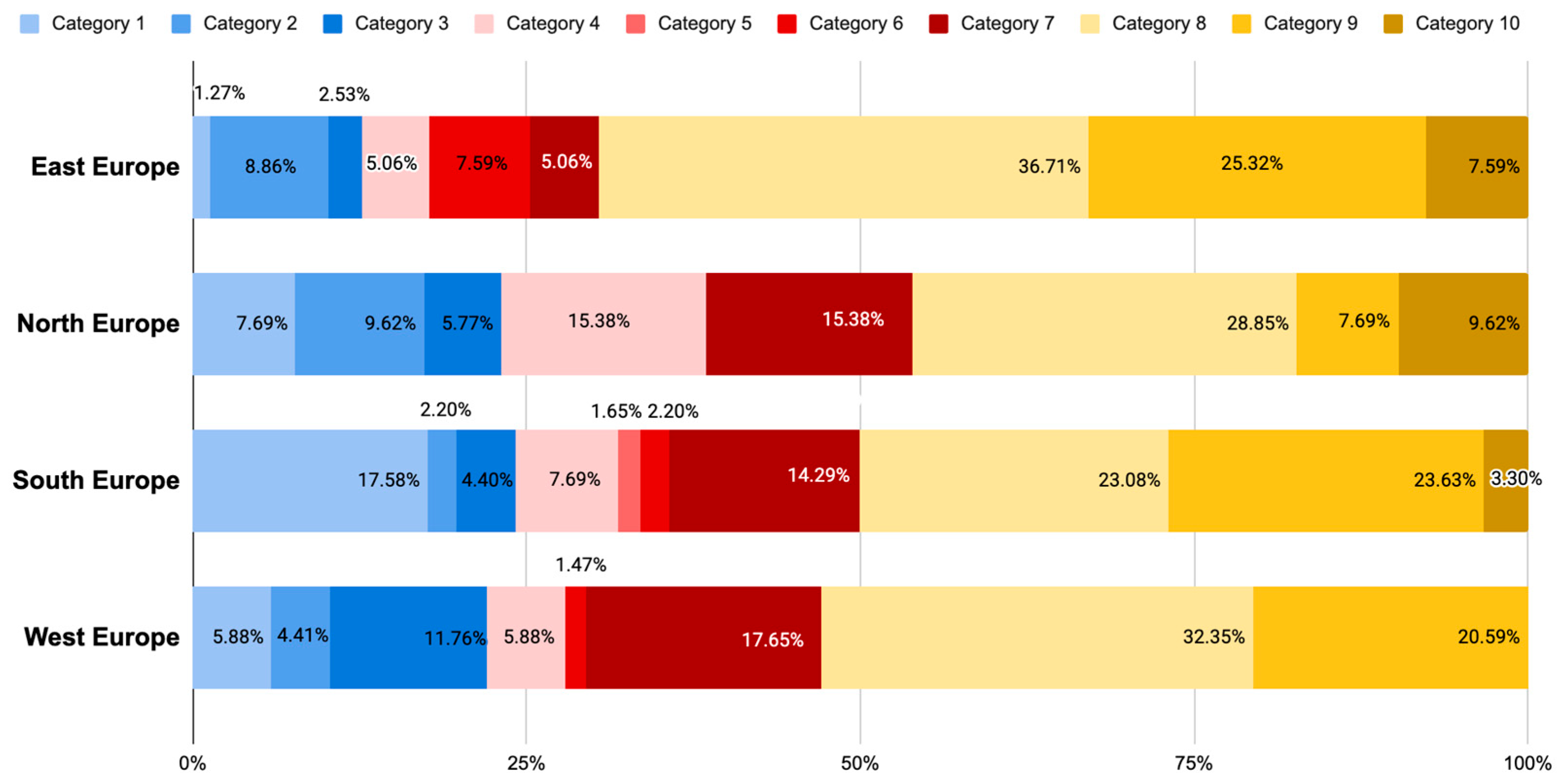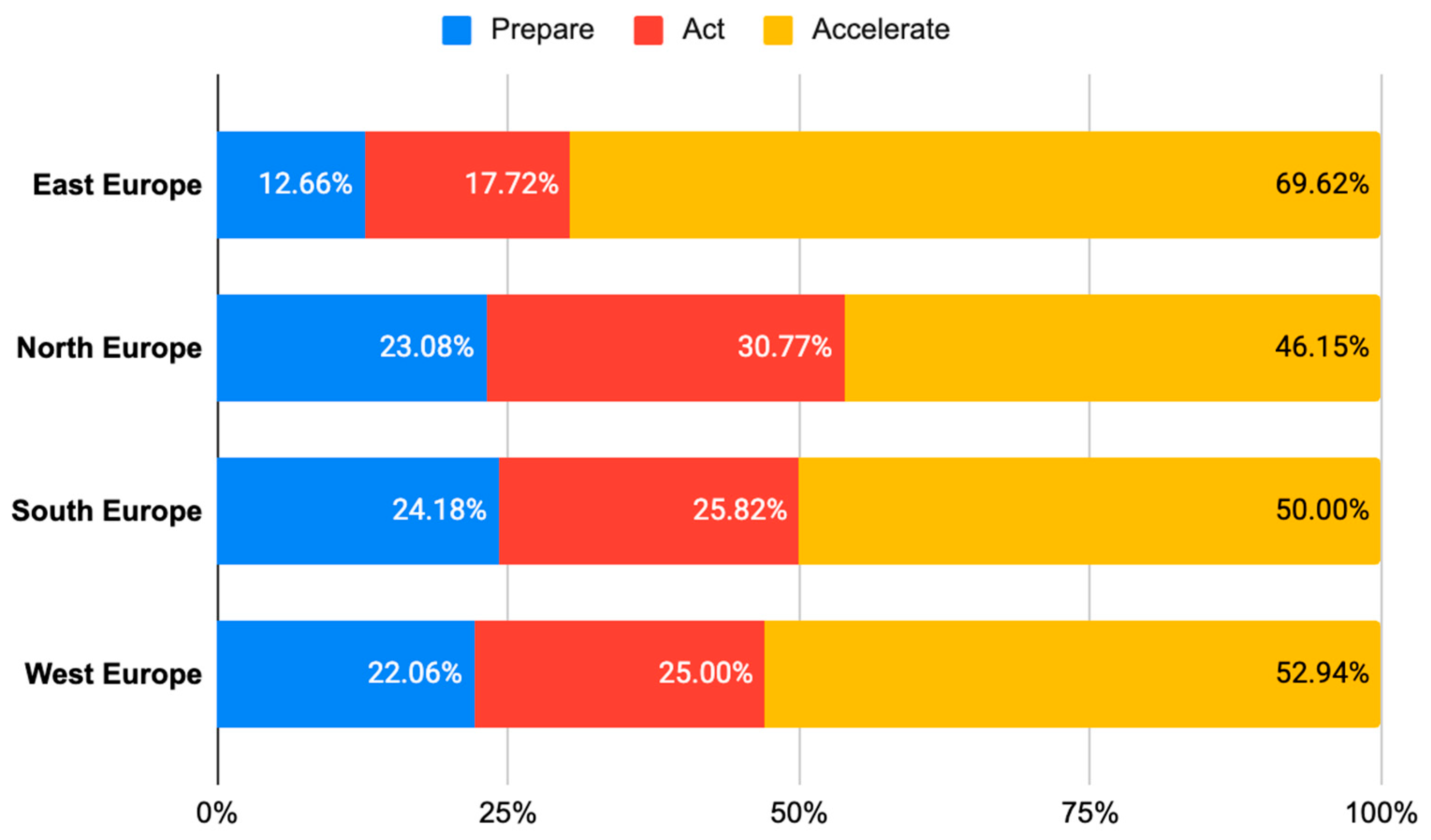On the other hand, Eastern Europe is highly acceleration-oriented, driven by 36.71% in Category 8, 25.32% in co-creation and cross-sector partnerships (Category 9), and 7.59% in Category 10, while the focus on the Prepare and Act phase categories remains relatively limited.