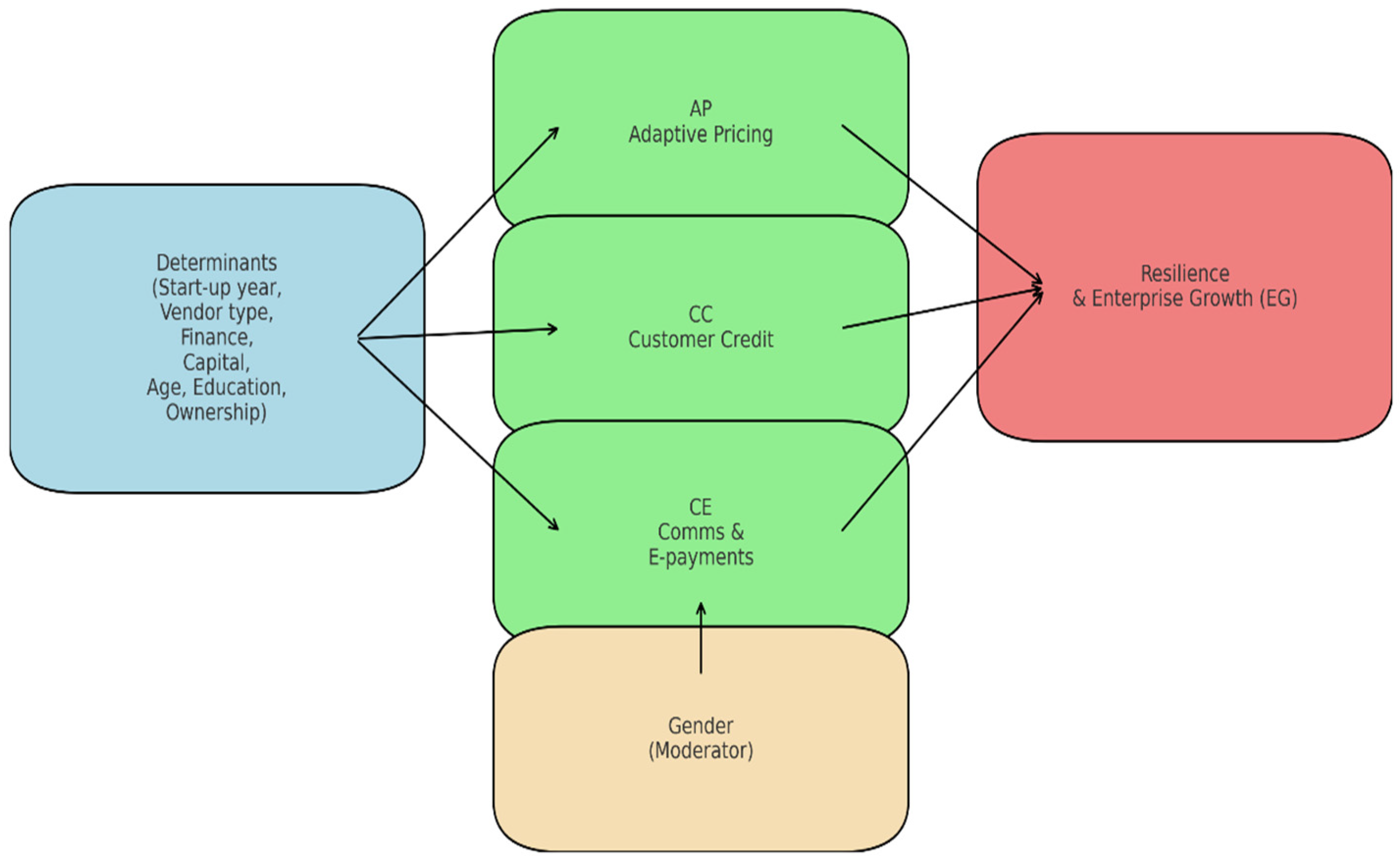 | Determinant | Adaptive Pricing (Coef, SE) | Customer Credit (Coef, SE) | Communications and E-Payments (Coef, SE) |