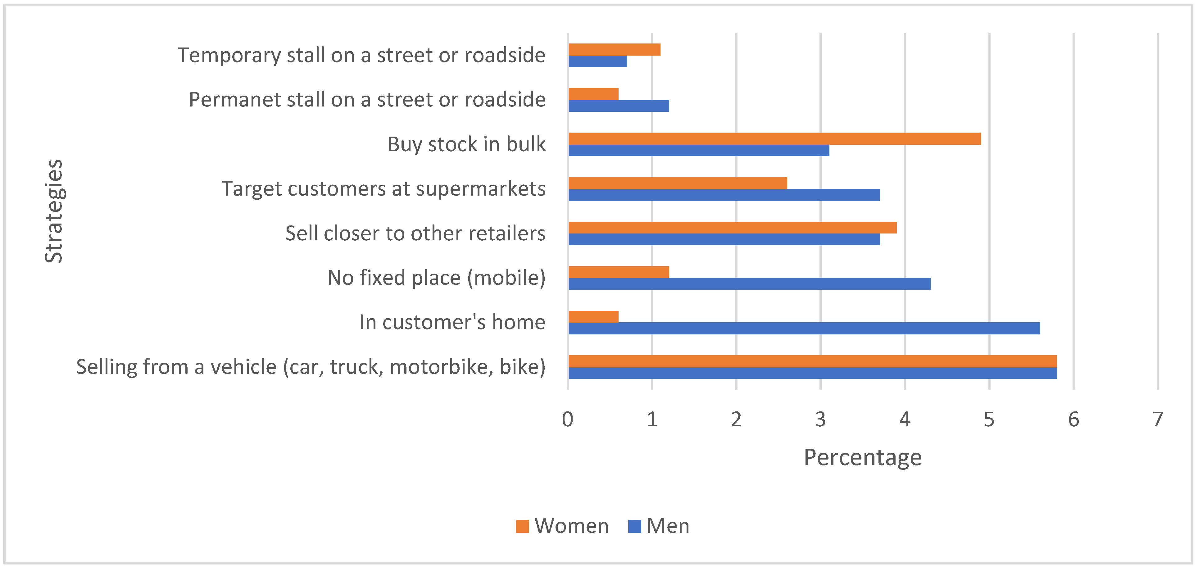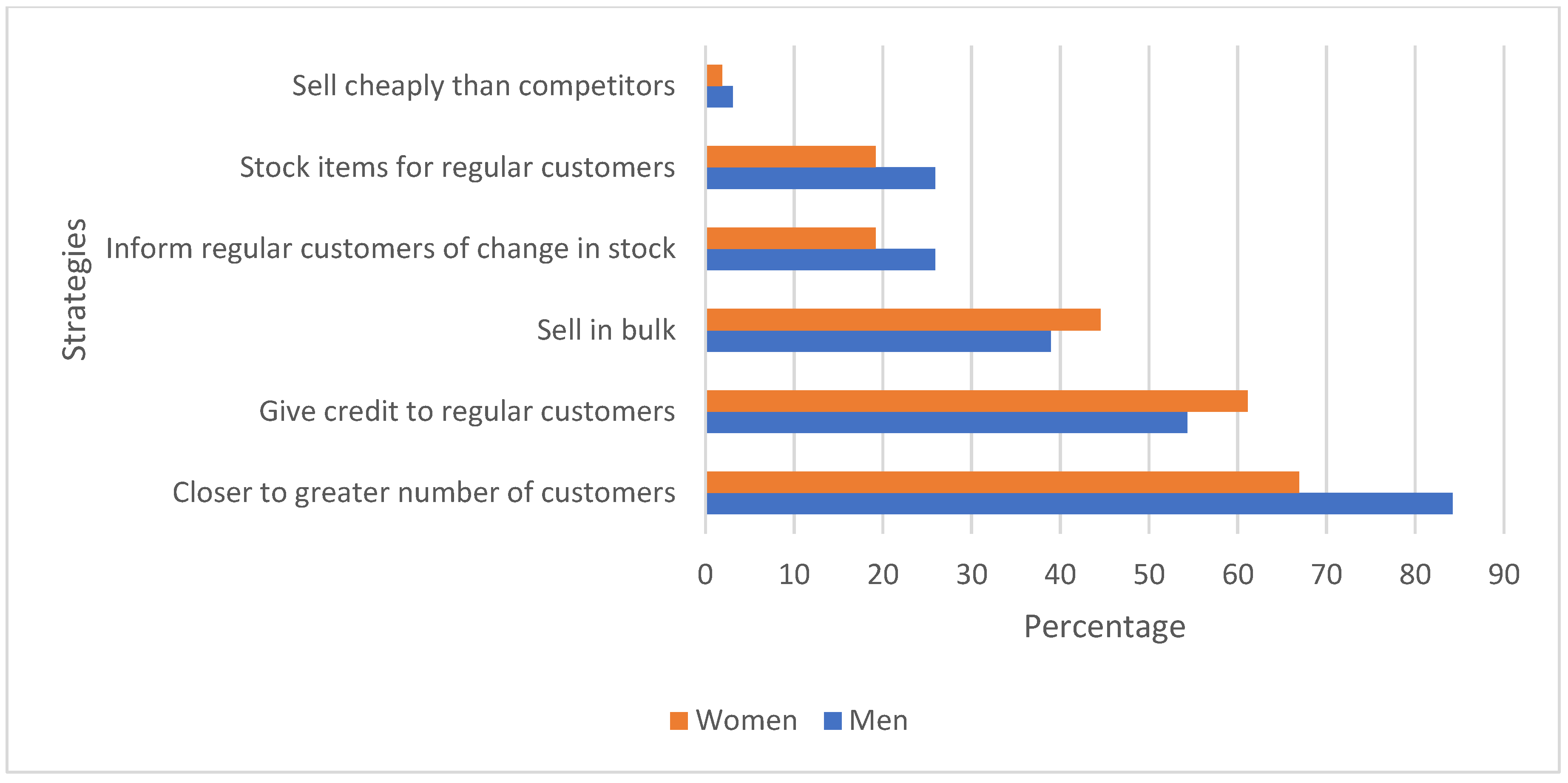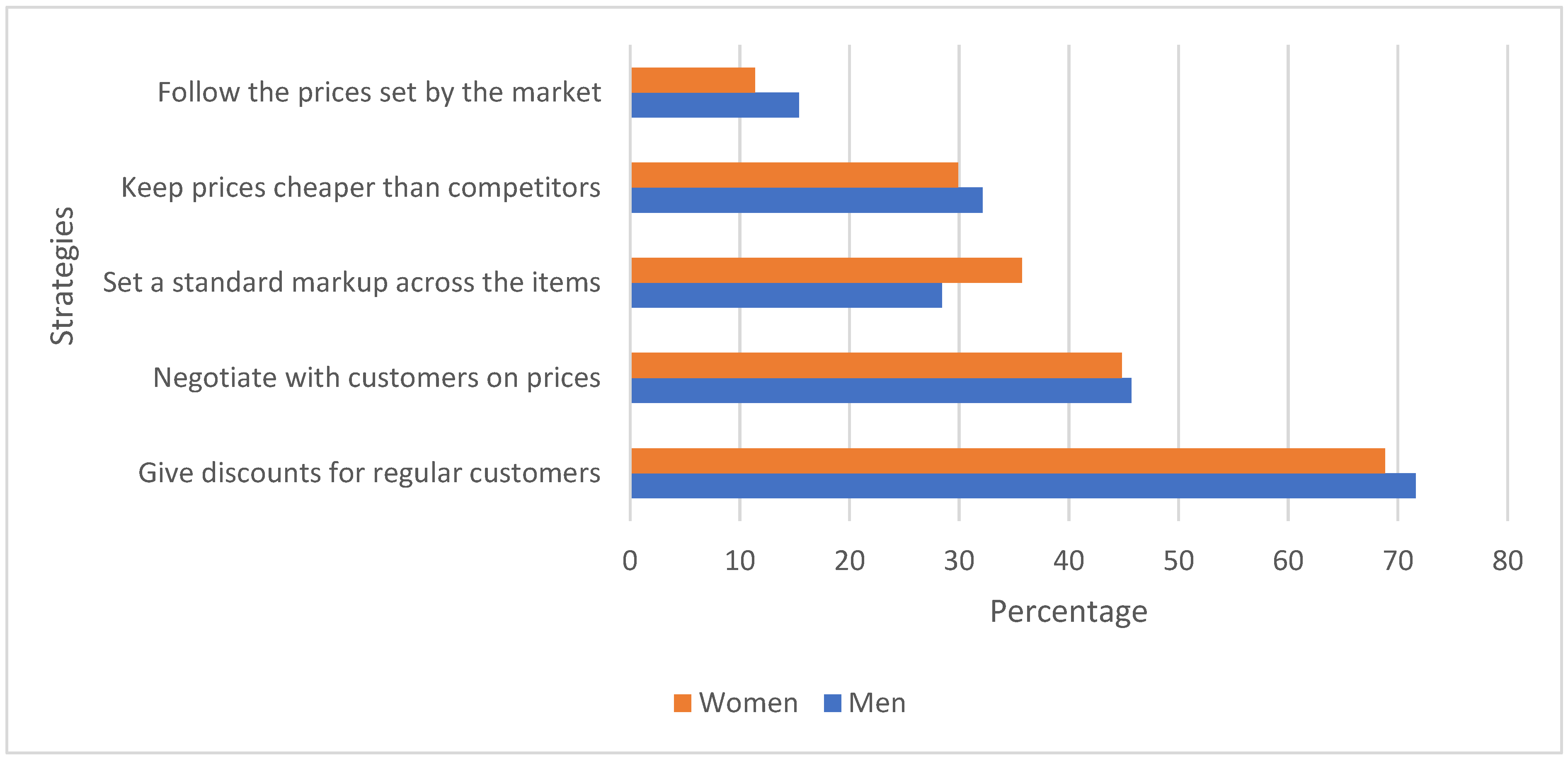 - Adaptive Pricing (AP): Figure 2 shows five strategies employed by traders to adjust prices in response to market conditions. Negotiating prices with customers and providing discounts to regular customers are the predominant strategies of both men and women. However, men are more likely than women to adopt these and most of the other adaptive pricing strategies.
