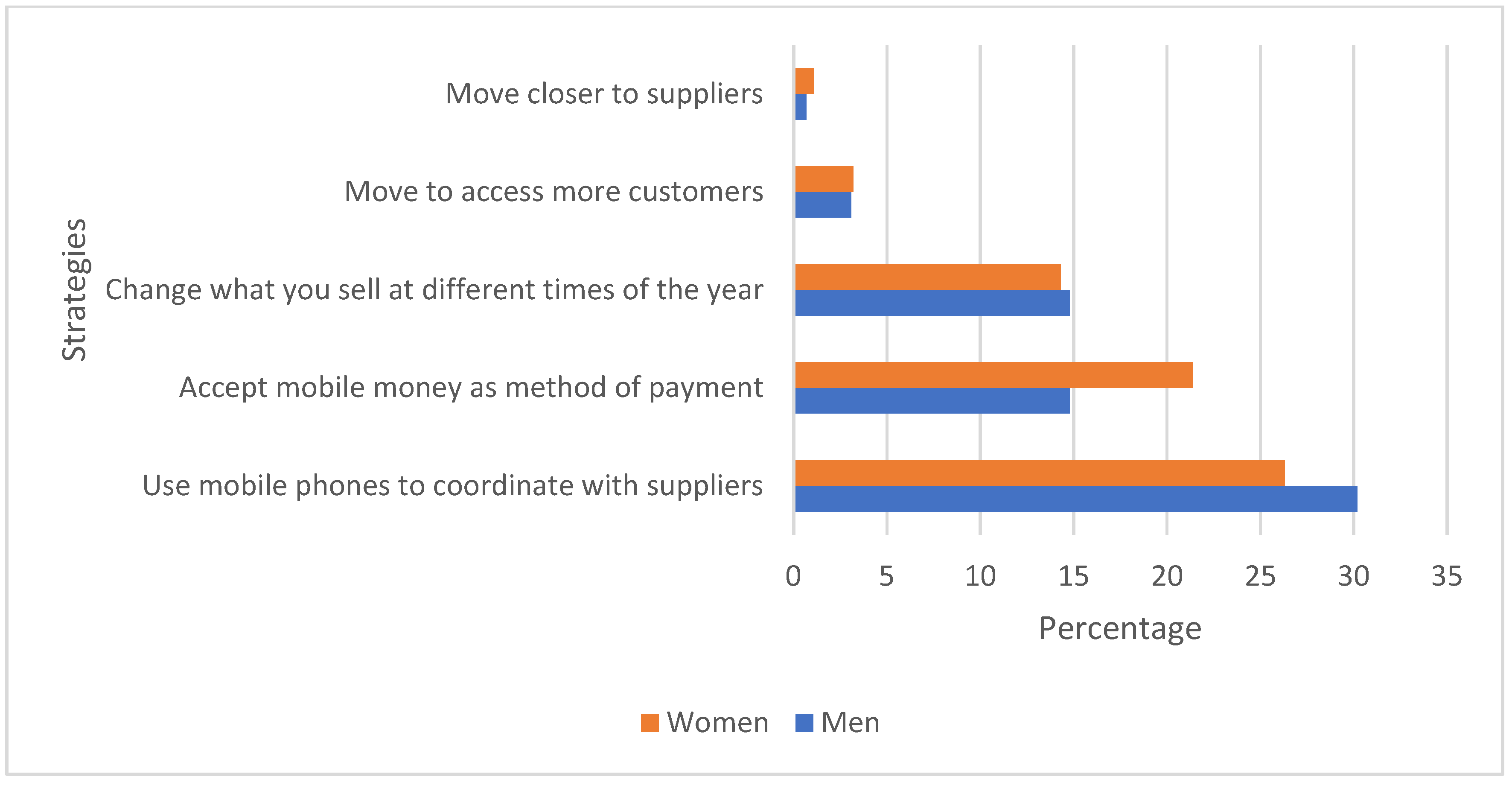 - Capability Evolution (CE): Figure 4 presents the uptake of digital and technological strategies. Just over one-quarter of the traders (27%) used mobile phones to coordinate with suppliers and customers, and 20% reported accepting mobile money as a payment method. Women are more likely to accept mobile money payments, while men are more likely to use the technology to coordinate with suppliers.