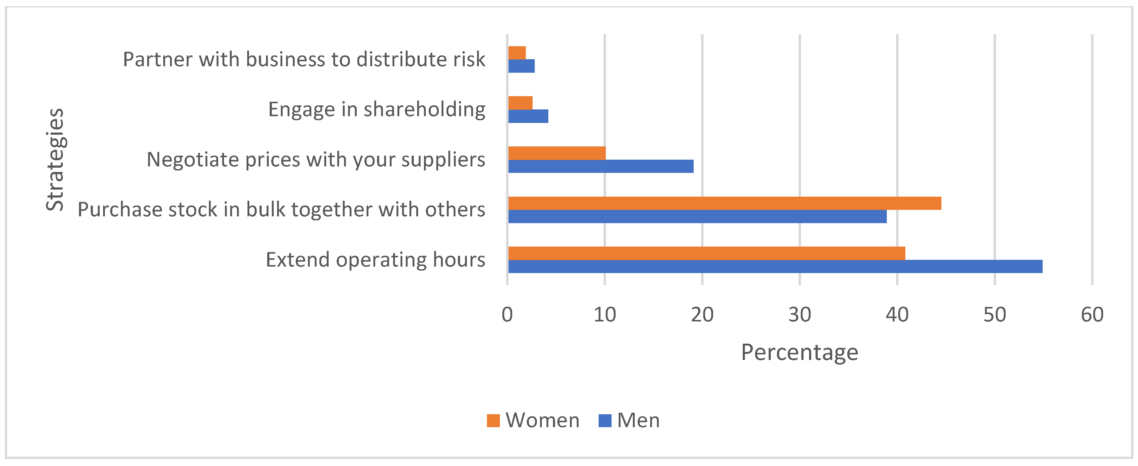 - Ecosystem Growth (EG). Figure 6 depicts strategies related to collective or network-based enterprise growth. The most common practices were extended working hours and purchasing stock together with other traders. Far fewer traders engaged in shareholding or partnerships.