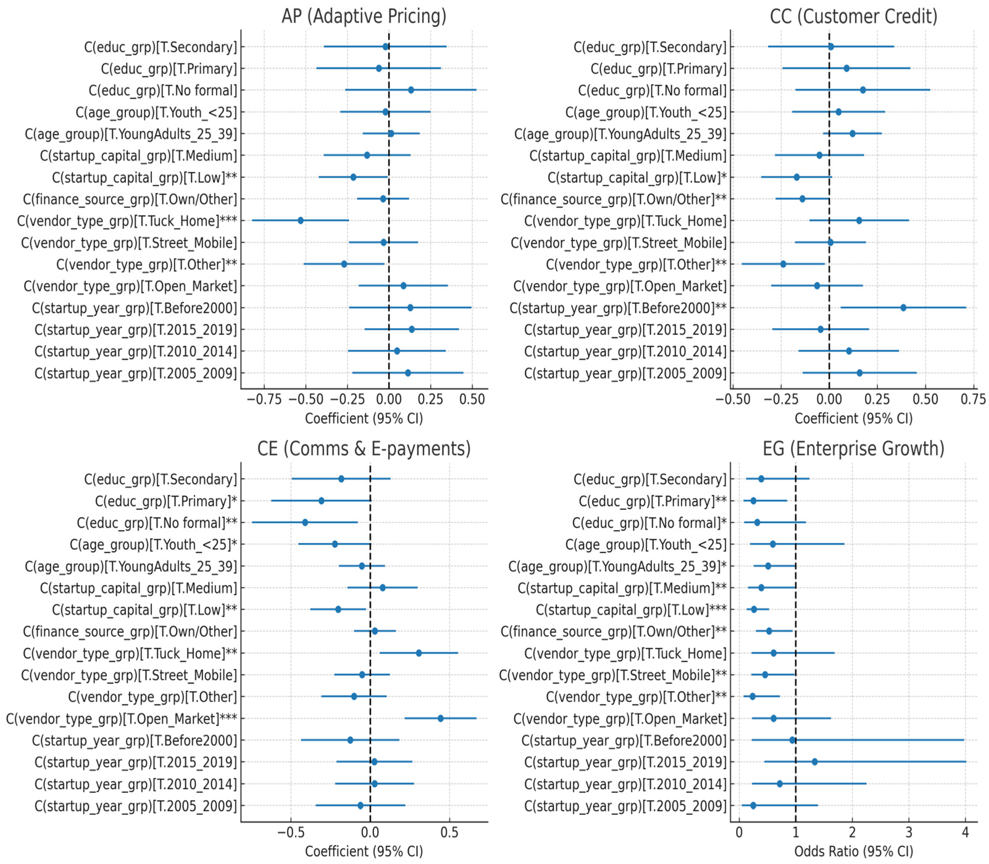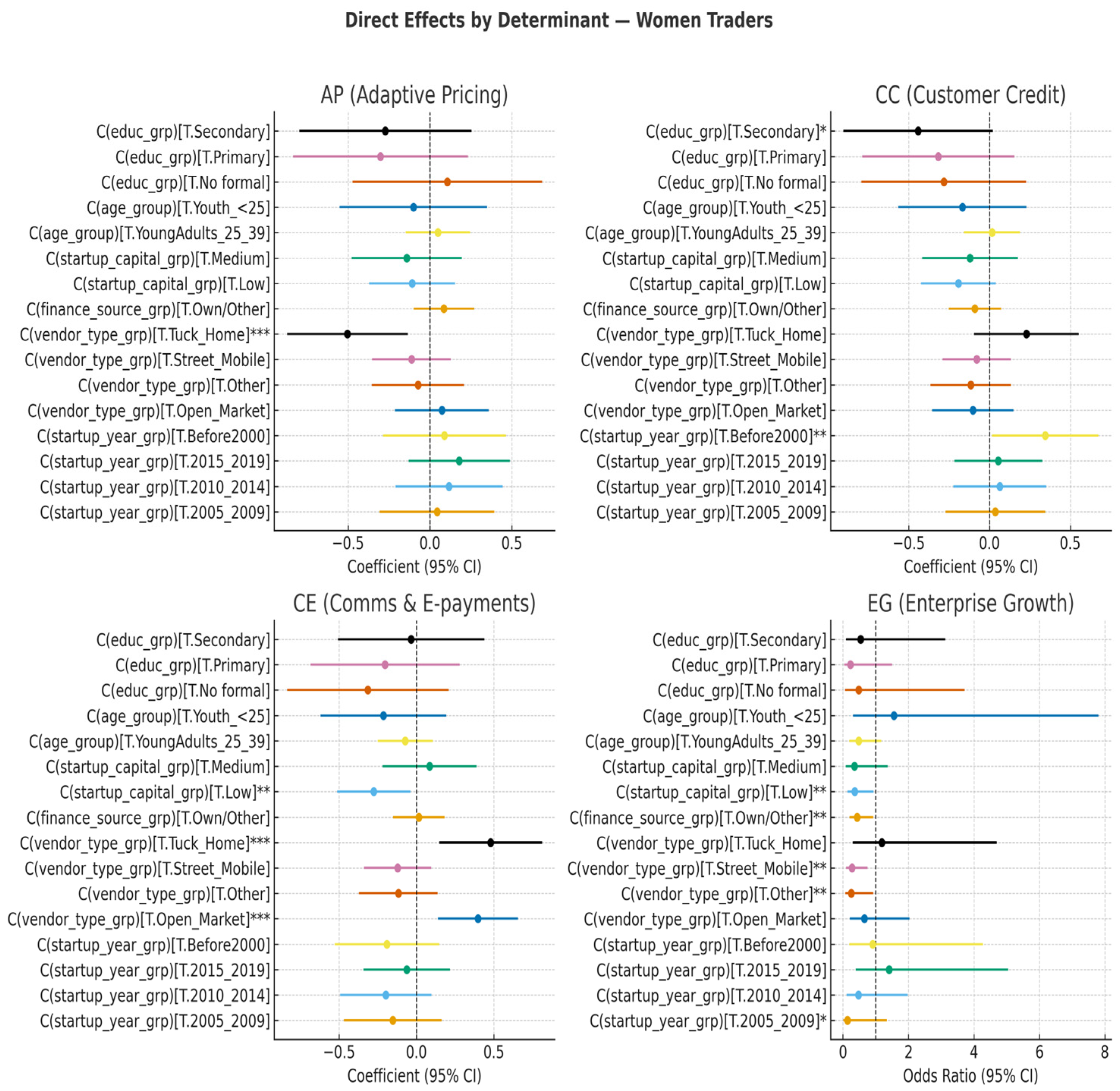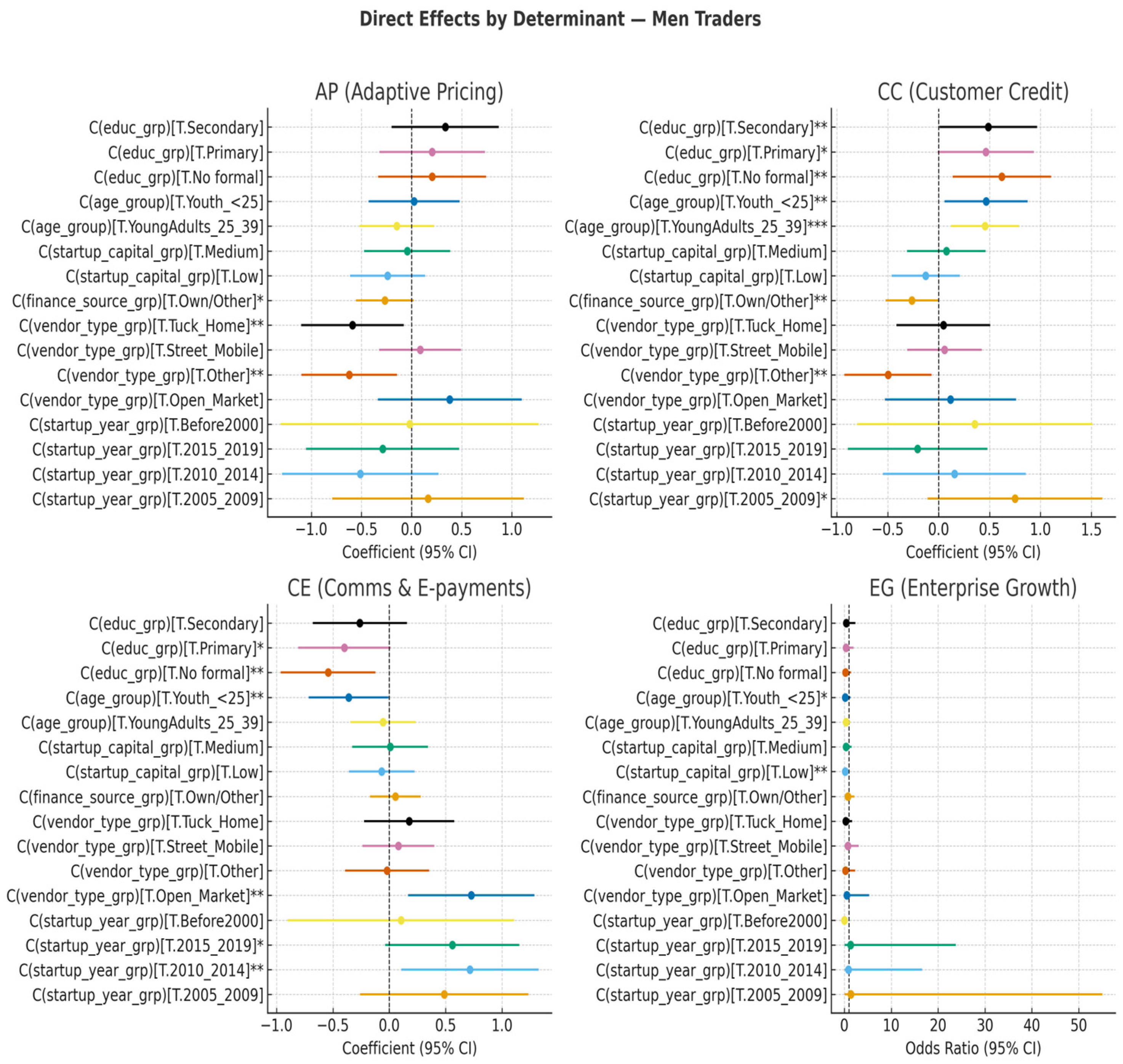 - Business start-up patterns differed significantly. Men were more likely than women to have started trading in 2010 or later (44.5% vs. 34.3%; χ2 = 23.90, p < 0.001), suggesting either greater recent male entry into the informal economy or faster turnover among male traders.