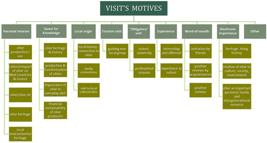 - Kouri, M.; Kondakis, M. “Green gold”—“Divine gift”—“The definition of family”: Perceptions and attitudes of domestic olive tourism visitors regarding the olive heritage in Greece. Via 2024, 25. [Google Scholar] [CrossRef]
