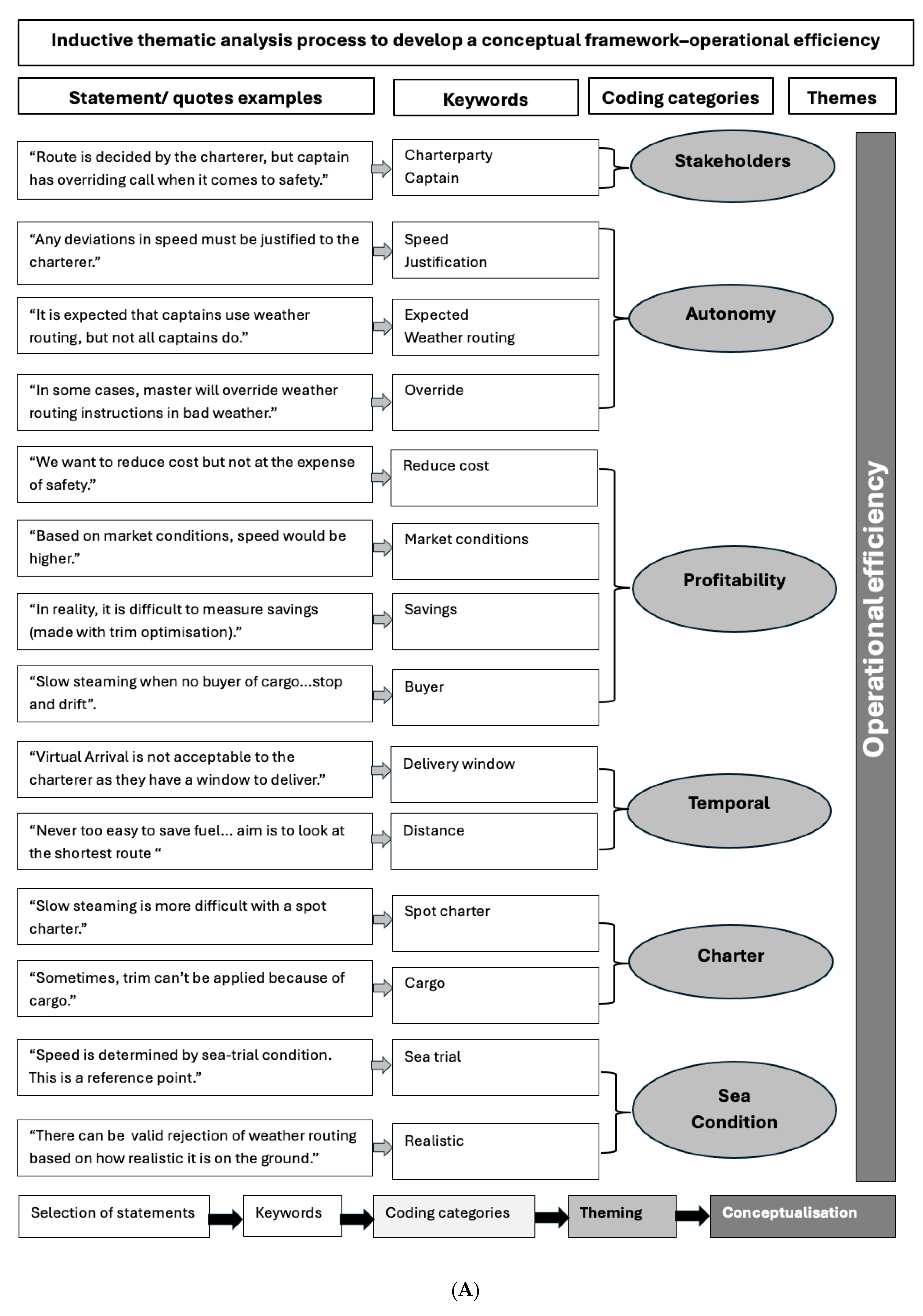 2]. A distinction, however, must be made between “technical efficiency”, which refers to some baseline conditions of the vessel, and “operational efficiency”, which considers the practicalities of the voyage, variability in environmental conditions, and commercial realities of operations. While technical specifications can be restricted by the infrastructure of a vessel, the dominion of human factors on operational efficiency is much more significant and the focus of this study. Research into operational efficiency measures is therefore crucial due to their potential application in facilitating reduction in fuel consumption and emissions immediately and in the short-term (reduction potential ranging from 10 to 30%), their lower need for extra capital, and the need to maximally optimise operational efficiency before a switch to more expensive zero-emission fuels [