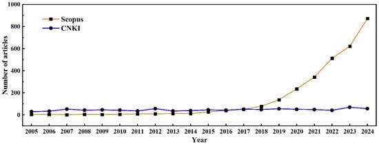 Number of published articles related to lignin-modified bitumen appearing in the CNKI and Scopus databases from 2005 to 2024.
