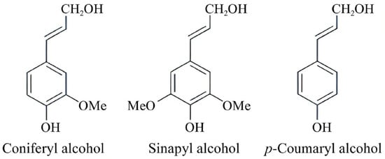 As a polyphenolic macromolecule, lignin’s architectural framework is constructed from three hydroxycinnamyl alcohol derivatives: p-coumaryl, coniferyl, and sinapyl alcohols, as depicted in Figure 4.
