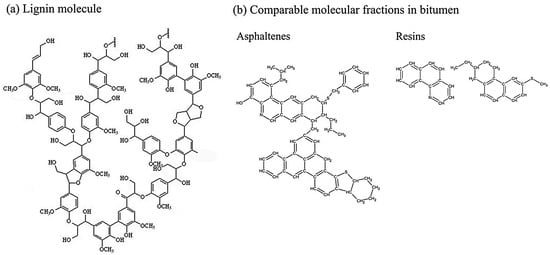 Chemical characterization of lignin moieties and asphalt constituents: (a) lignin-based functional elements, (b) bitumen-derived components (asphaltenes/resins).