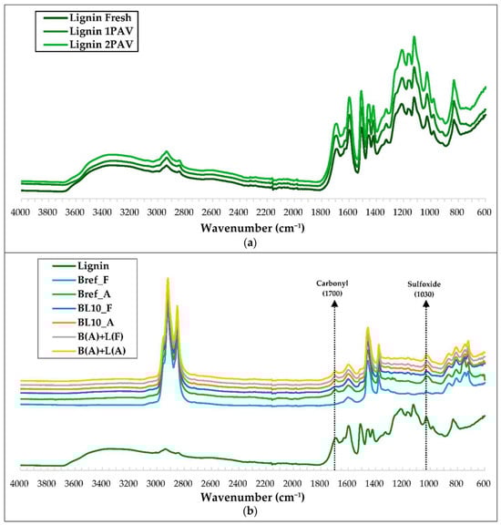 FTIR analysis of (a) lignocellulosic aging profiles across degradation stages and (b) compositional matrices: native lignin, neat bitumen, and lignin–bitumen composites [4].