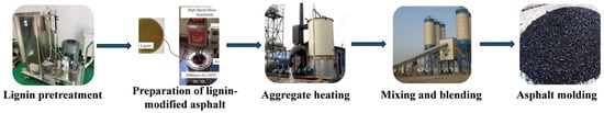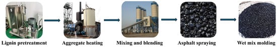 The dry process encompasses steps such as the pretreatment of lignin, heating of aggregates, dry blending and mixing, asphalt spraying, and wet mixing and shaping, as depicted in Figure 11. As part of the pretreatment, lignin is dried and ground, while the aggregates are heated to a temperature 10–15 °C above the conventional mixing temperature to offset the heat absorption of lignin [78]. After ensuring that the asphalt thoroughly moistens the aggregates, the lignin and aggregates are dry-blended, the asphalt sprayed, and finally the asphalt mixture wet-blended for shaping. The dry process involves no premixing and can be carried out directly in the mixer. It has lower equipment requirements and is suitable for adding multiple modifiers (such as rubber and plastic fibers), and is less sensitive to the content of lignin [79,80]. However, lignin tends to aggregate in dry-process operations, necessitating prolonged mixing durations or optimization of the fiber length-to-diameter ratio to enhance homogeneity [81,82]. The fatigue life of its mixture might decrease due to an overly high lignin content, and the void in the mineral aggregate (VIM) of the dry-mixed material is relatively high, which might require additional fillers for adjustment [79,83,84].