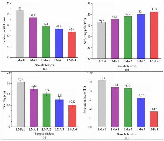 General characteristics of asphalts: (a) penetration; (b) softening point; (c) ductility; (d) PI [50].