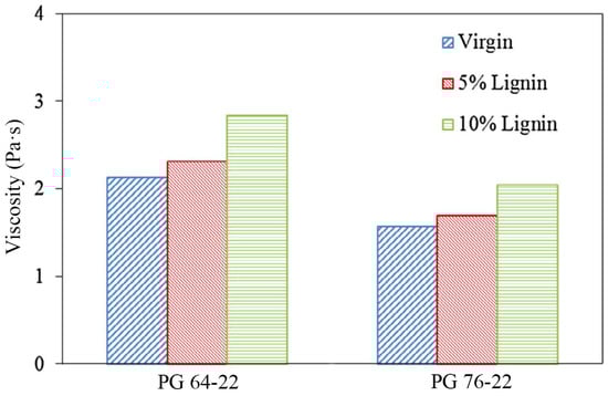 Viscosity serves as a critical performance indicator in asphalt mixture design and pavement construction. Viscosity directly influences the fluidity, workability, and ultimate performance of asphalt mixtures, and determines the optimal mixing temperature and the acceptable range of compaction temperatures [105]. Generally, lignin-modified asphalt has higher viscosity than unmodified asphalt. This is advantageous for improving the storage modulus of asphalt and only slightly affects the loss modulus [22]. Xu et al., 2017 [87] assessed the workability and mixability of asphalt binders using rotational viscosity measured at 135 °C. Figure 14 illustrates the viscosity characteristics of unaged PG 64–22 and PG 76–22 asphalt binders (unaged) containing 0%, 5%, and 10% lignin. The study indicates that adding lignin powder to base asphalt increases its viscosity. Although higher processing temperatures might be indicated, the measured viscosity values satisfy the Superpave specification requirements. Even with 10% lignin added, it retains adequate fluidity for engineering use. Adding lignin to asphalt results in asphalt with increased viscosity. This phenomenon results from the aromatic components in lignin molecules interacting with the analogous structures present in asphalt. The ether groups, phenolic groups, and polar groups in lignin also have strong interactions with the polar structure and heteroatoms in the asphalt. Acting as a connecting agent, lignin can create numerous cross-links within the asphalt structure, enhancing its overall coherence and strength. The specific structure of lignin facilitates the establishment of a three-dimensional network in asphalt, consequently improving its structural integrity [103].