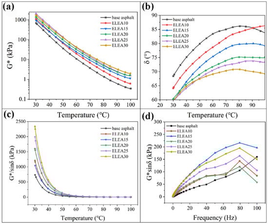 Dynamic shear rheometer tests, including temperature and frequency scans, were conducted for both base asphalt and ELEA. The results are presented as follows: (a) complex shear modulus G*; (b) phase angle δ; (c) rutting resistance factor G*/sinδ; (d) fatigue factor G*sinδ [87].