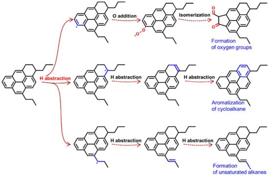 Lignin’s molecular architecture exhibits structural heterogeneity with multiple oxygen-containing moieties, notably alcoholic hydroxyls (-OH), methoxyl (-OCH3) substituents, ketonic carbonyls (C=O), and carboxylic acid (-COOH) functionalities. These functional groups endow lignin with distinctive chemical reactivity and physical characteristics [3]. The existence of hydroxyl and carboxyl groups renders lignin highly polar and hydrophilic, whereas the presence of methoxy groups enhances its hydrophobicity and thermal stability, which is beneficial for improving the durability and anti-aging capability of asphalt [20]. In asphalt modification, these structural features of lignin enable it to engage in multiple chemical and physical interactions with the components in asphalt, thereby improving asphalt properties [47,48]. Compared with similar molecular components in asphalt, as depicted in Figure 6, lignin is more abundant in hydroxyl groups, and it can undergo chemical modification to induce better compatibility with asphalt [3]. Using lignin as a compatibilizer can significantly improve the interfacial affinity of waste plastics with asphalt, which in turn improves the overall performance of the modified asphalt [16].