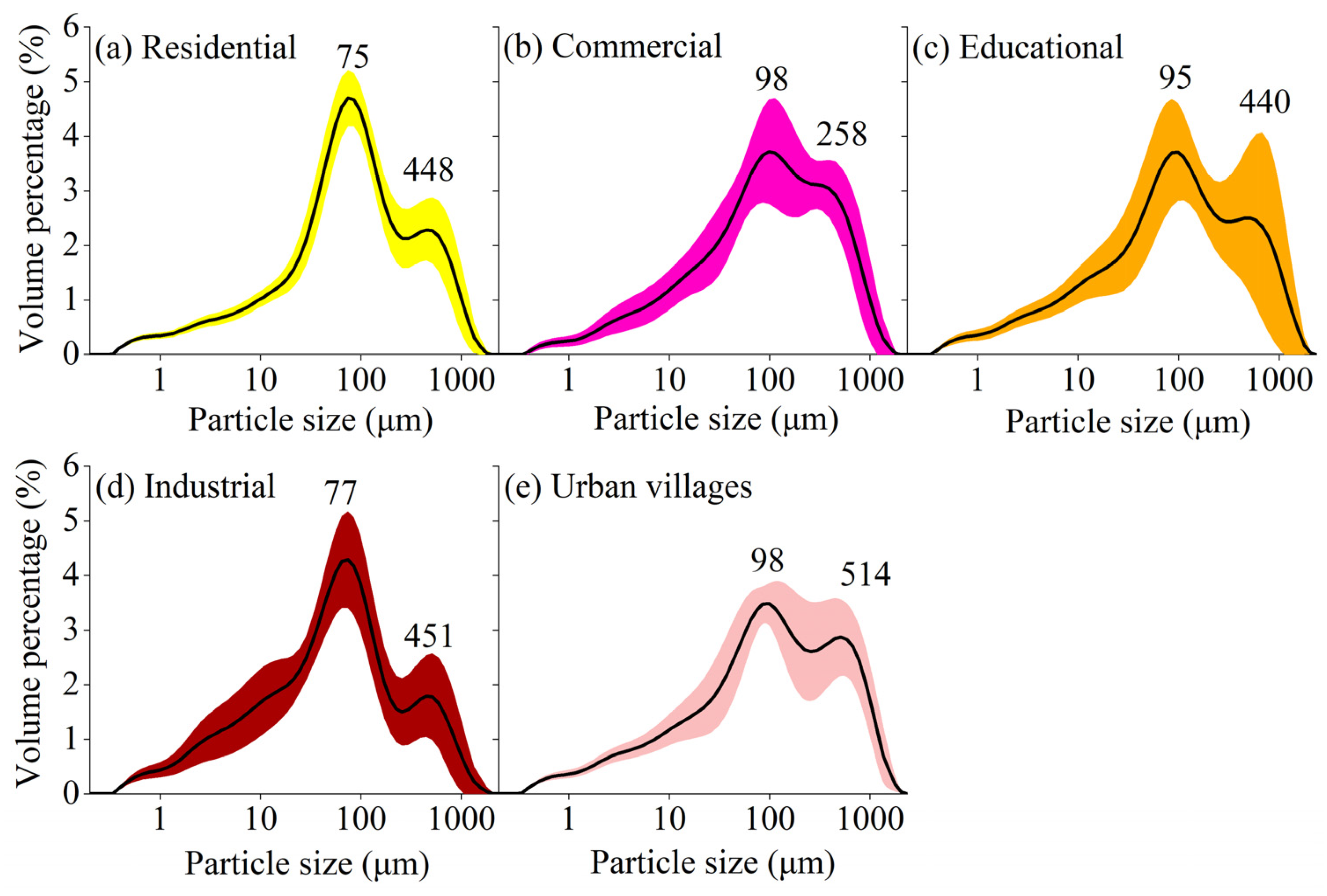3.2. Particle Size Characteristics of RDS in Different Functional Zones