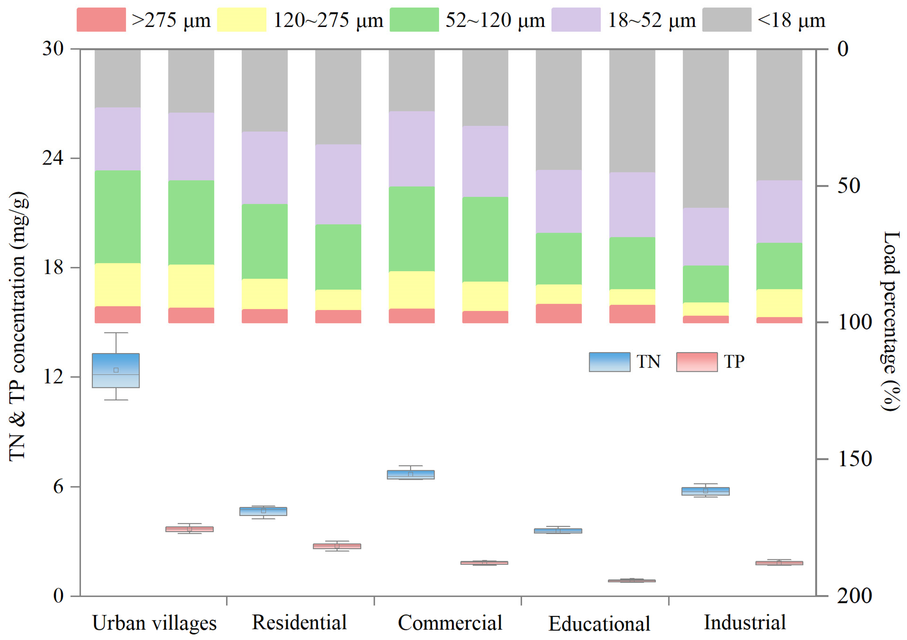 - Sample processing: Samples were dried, weighed after removing impurities through a 2 mm sieve, and their particle size distribution (0.02–2000 μm) was determined using a laser particle size analyzer (Master2000, Malvern, Worcestershire, UK). Subsequently, RDS was evenly sieved into 5 particle size groups based on particle size distribution characteristics (0~d20, d20~d40, d40~d60, d60~d80, >d80), with the purpose of ensuring each fraction had equal mass. Incorporating the actual particle size detection results, the specific particle size ranges for the final grouping were confirmed as <18 μm, 18~52 μm, 52~120 μm, 120~275 μm, and >275 μm. For each RDS group, the total nitrogen (TN) and total phosphorus (TP) contents were measured using alkaline potassium persulfate digestion followed by spectrophotometry [31]. All chemical analyses were performed at the Water Environment Laboratory, Dangtu Scientific Experiment Base, Nanjing Hydraulic Research Institute (Ma’anshan, China). To ensure data reliability, strict quality assurance and quality control procedures were implemented. Replicate samples (n = 3) were analyzed for the total samples, yielding relative standard deviations (RSD) of less than 5% for both TN and TP. Procedural blanks indicated no detectable interference. Analytical accuracy was verified using standard reference materials (GSS series) and spiked samples, with recovery rates ranging from 90% to 110%. The method detection limits (MDL) were 10 mg/kg for TN and 5 mg/kg for TP.