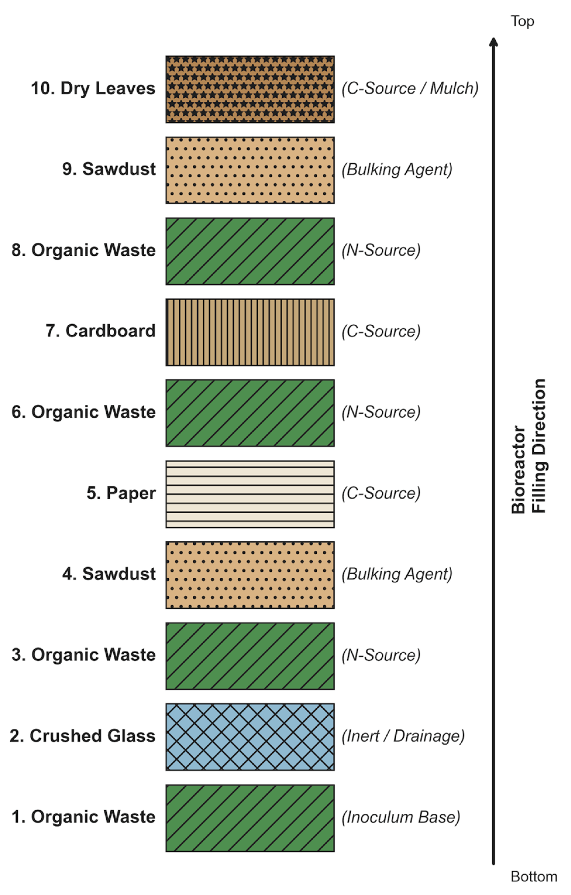 | Bioreactor Capacity (L) | Organic Waste (kg) | Crushed Glass and CCW (kg) | Sawdust (kg) | Paper (kg) | Cardboard (kg) | Dry Leaves (kg) | Total Weight (kg) |