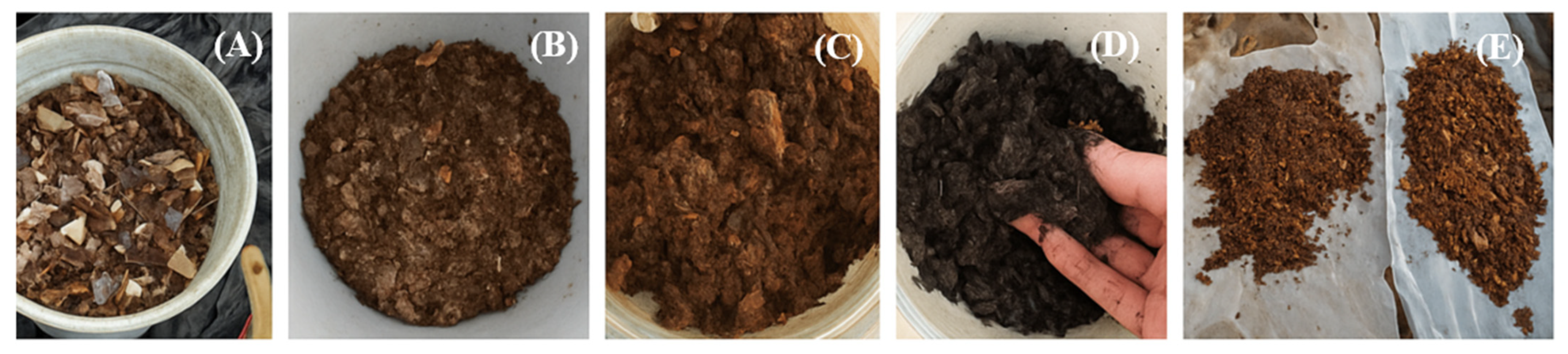 - Koetz, G.M.; Dalmora, A.C.; Hernández Palma, H.G.; Dick, D.; Selbach, P. Characterization of humic substances developed during the composting of class II A organic solid waste: A case study in a composting plant in Montenegro, Brazil. Lat. Am. Dev. Energy Eng. 2022, 3, 11–22. [Google Scholar] [CrossRef]