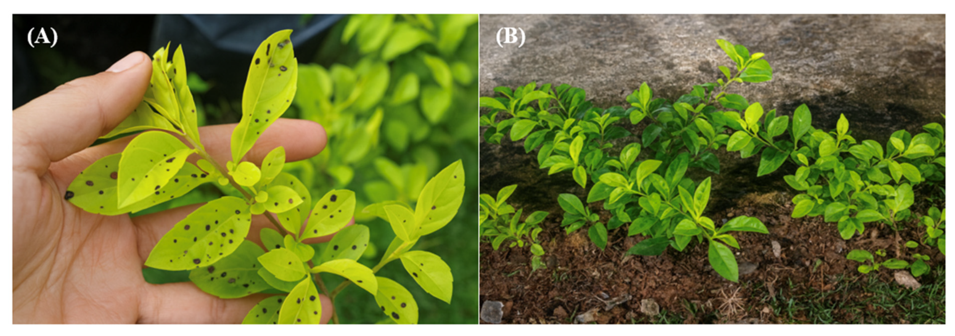 - Moreira, L.L.; Calvelli, J.V.B.; Cunha, A.R.D.; Alves, P.I.; Bastos, R.G.; Trindade, L.D.O.R.; da Silva, G.A.; Barbosa, S. Can pruning enhance the allelopathic effect? A study with Golden-Dewdrop. Ornam. Hortic. 2024, 30, e242705. [Google Scholar] [CrossRef]