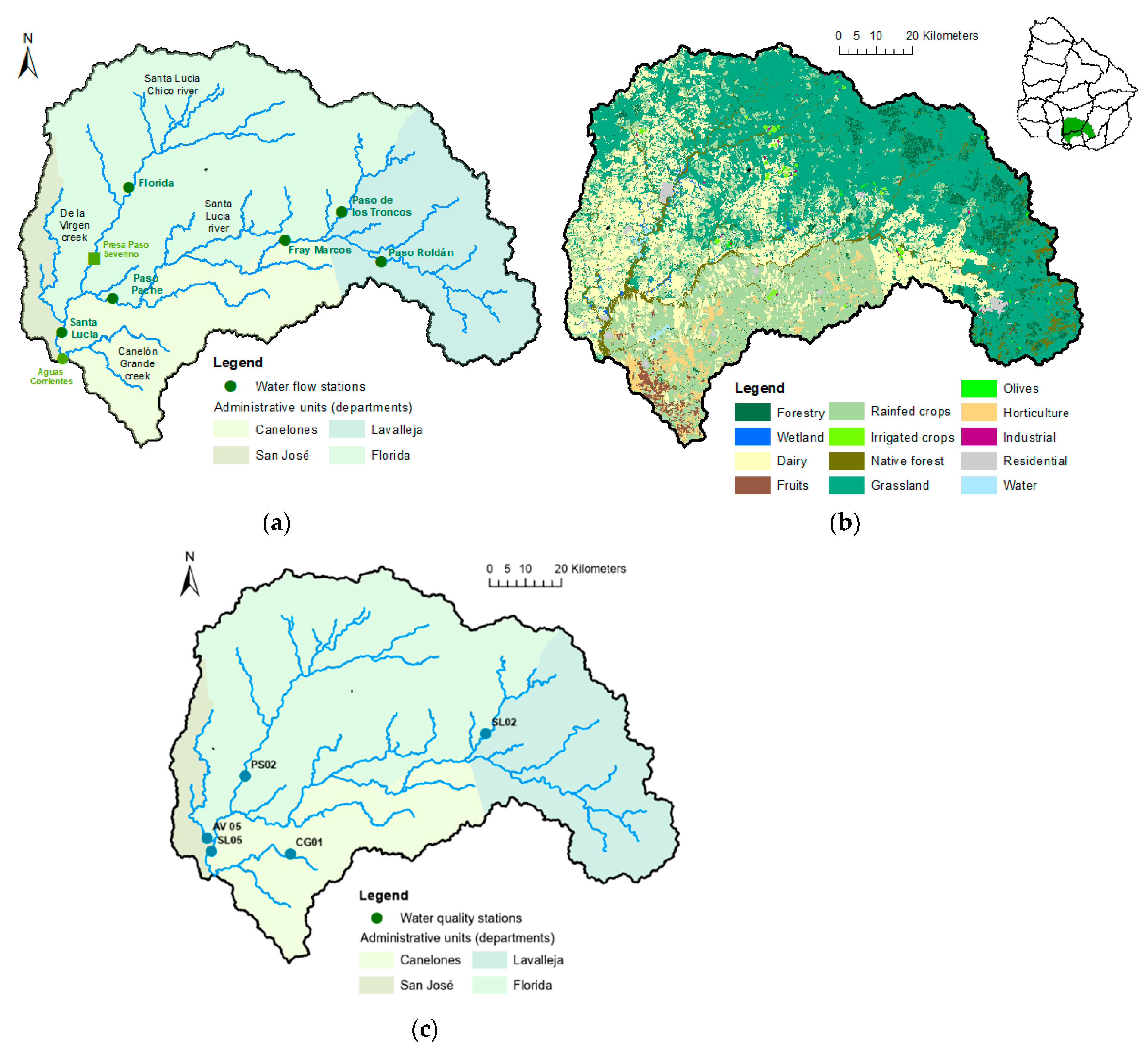 3 and total P. The analysis was conducted at five monitoring stations, selected to represent different dominant land uses in each location; dairy farms in AV05 (De la Virgen creek) and PS02 (Paso Severino), agriculture in CG01 (Canelón Grande), and grassland in SL02 (Santa Lucía). Additionally, the inclusion of SL05 (Santa Lucía) station was justified by its proximity to the basin’s outlet. Please refer to