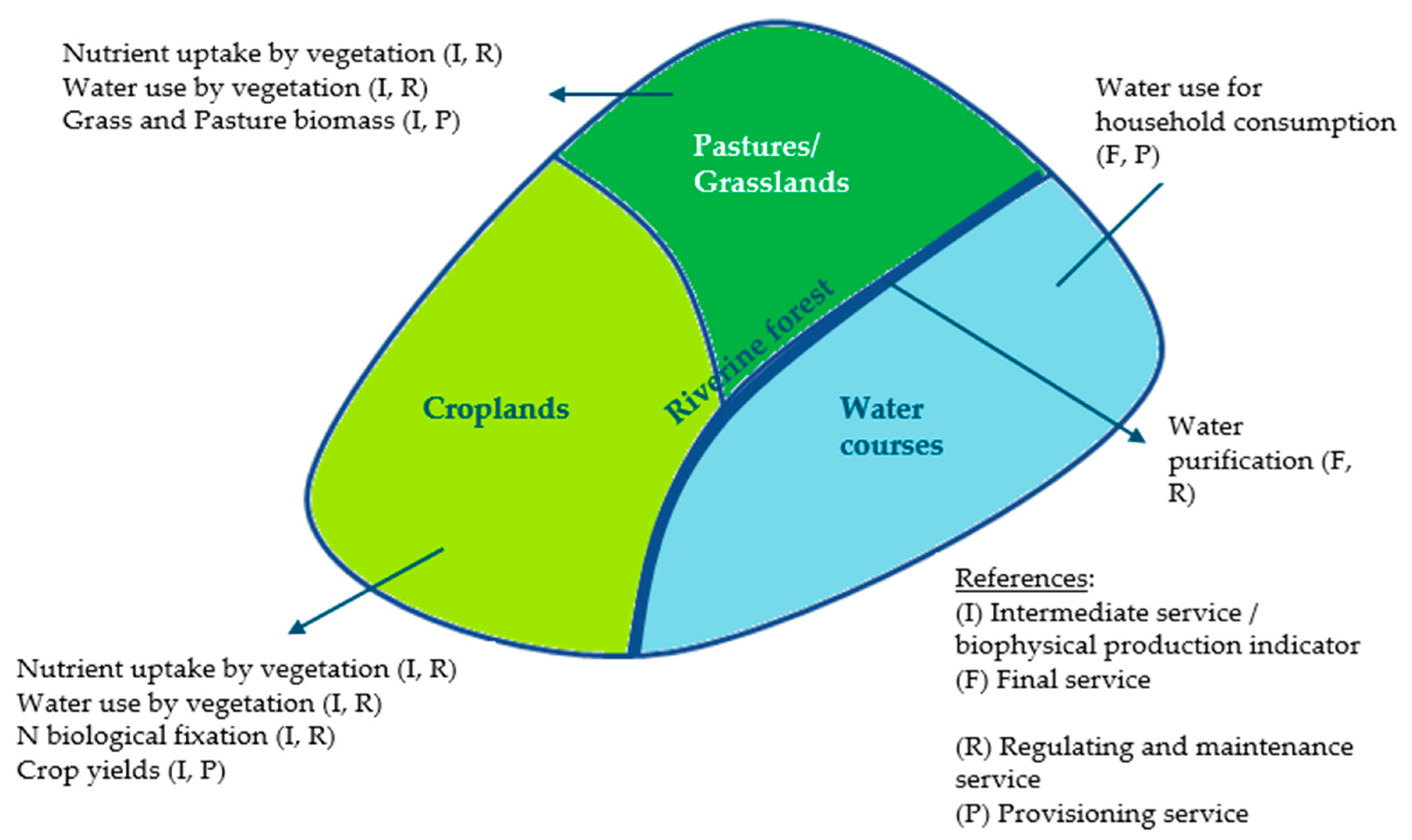 Following the SEEA—Ecosystem Accounting framework, a distinction is made between final ecosystem services, intermediate ecosystem services ecosystem condition and pressure indicators. Final ecosystem services are those directly benefiting society, such as water provision for human consumption and water purification. Intermediate ecosystem services are defined as biophysical flows generated by ecosystems that support economic production but do not directly enter final demand. In this study, these include water use by vegetation, nutrient uptake by crops and pastures, and biomass production, which underpin agricultural output but are not themselves final services (see