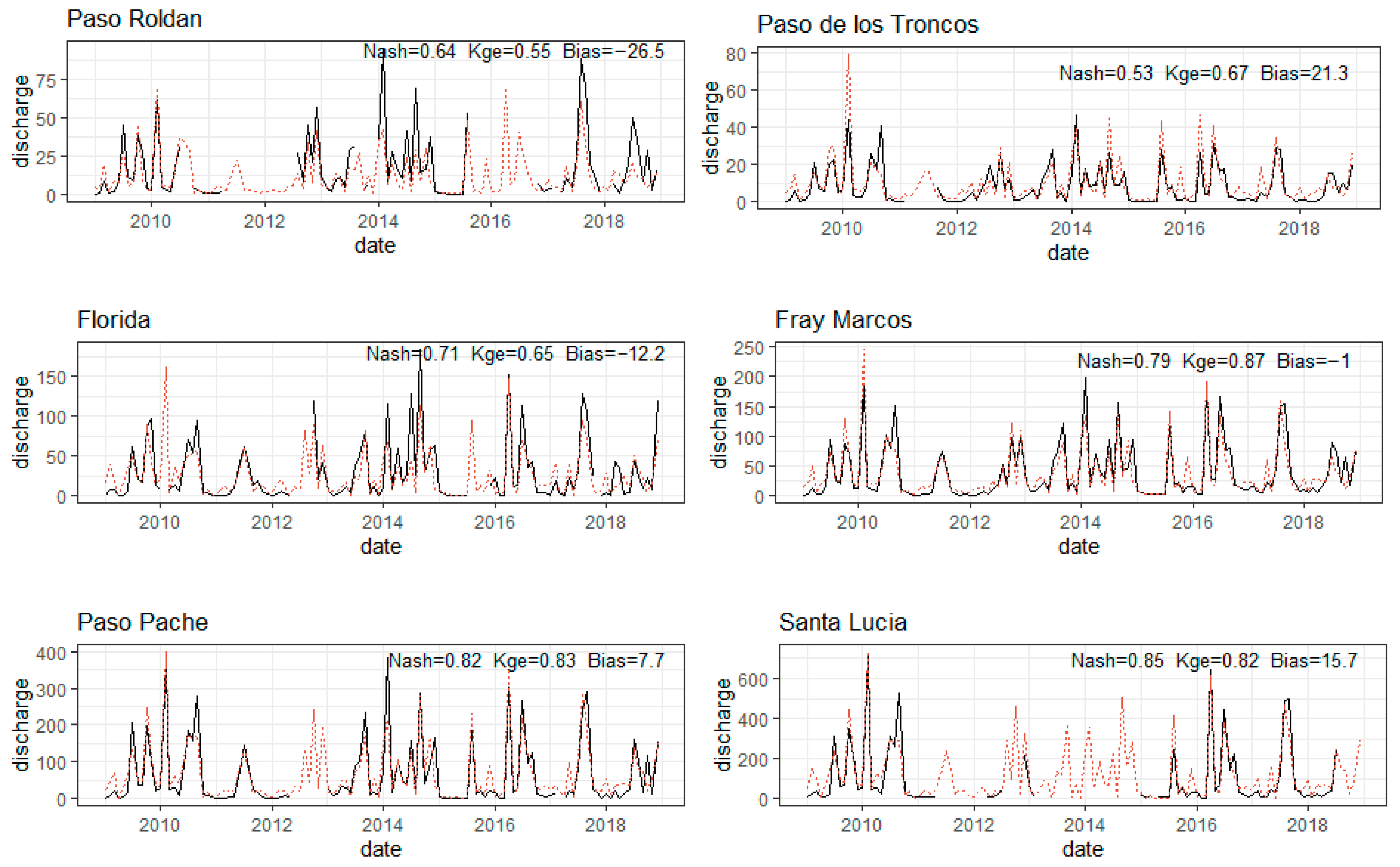 Flow calibration was based on observations from six monitoring stations distributed across the basin: Paso de los Troncos, Paso Roldán, Florida, Fray Marcos, Paso Pache, and Santa Lucía R11 (10 km upstream of Aguas Corrientes) (refer to the