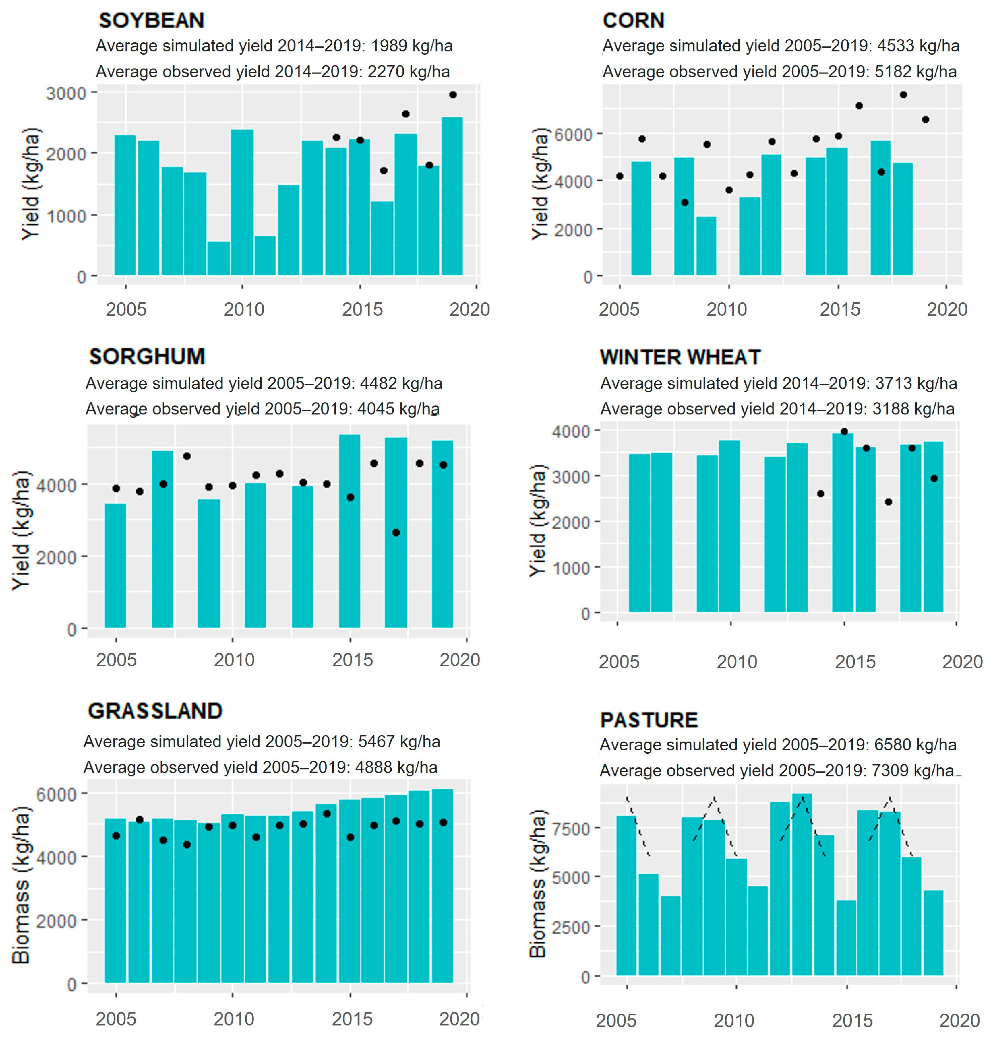 In this study, model performance was evaluated for three groups of variables: water flow, agricultural productivity (crop yield and grass/pasture biomass), and water quality.