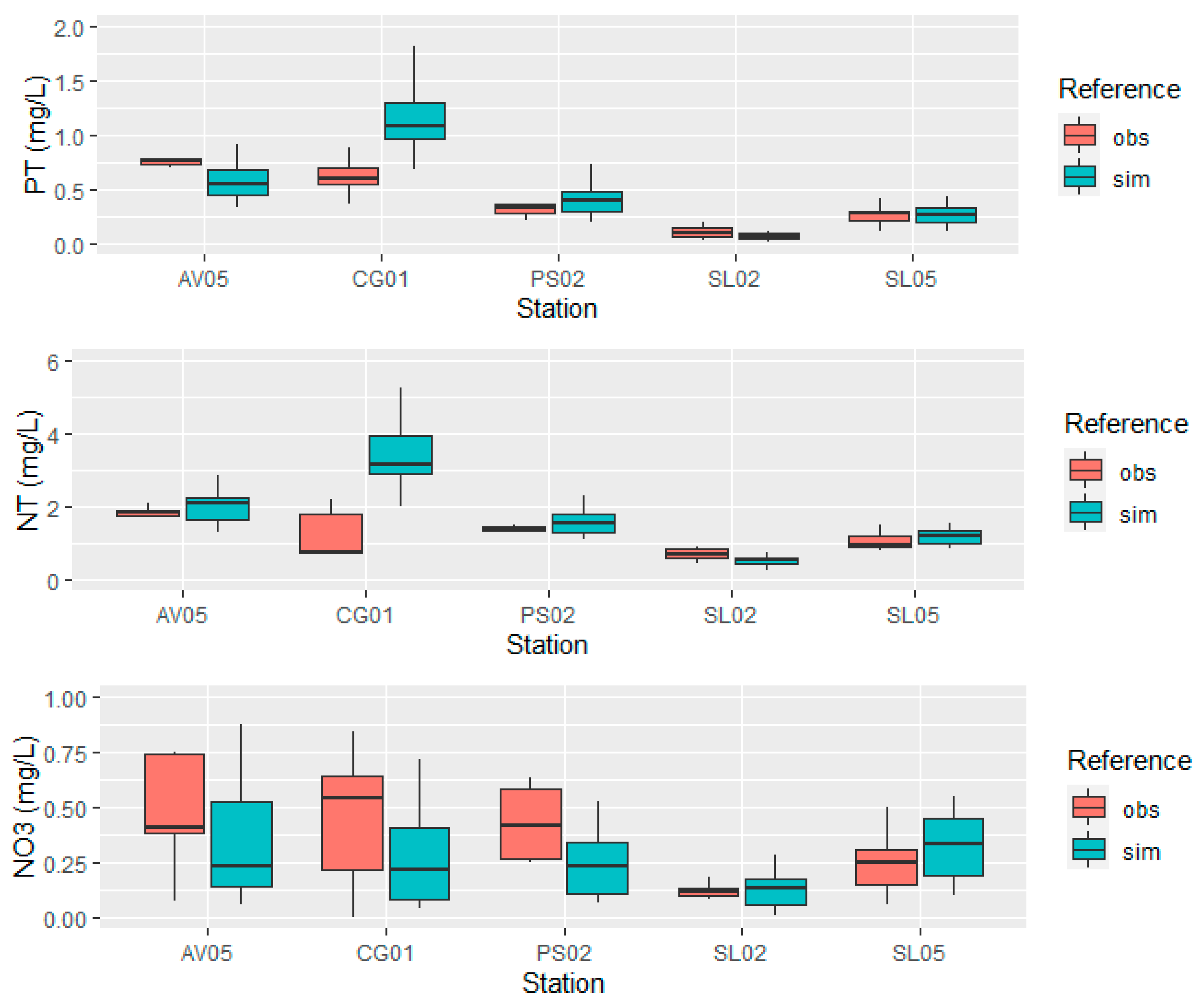 Water quality calibration was conducted on a bimonthly basis for the period 2011–2019, reflecting the temporal resolution of available observations. The variables examined are nitrate, total nitrogen, and total phosphorus. Soft calibration was performed by adjusting a limited number of nutrient-related parameters (see