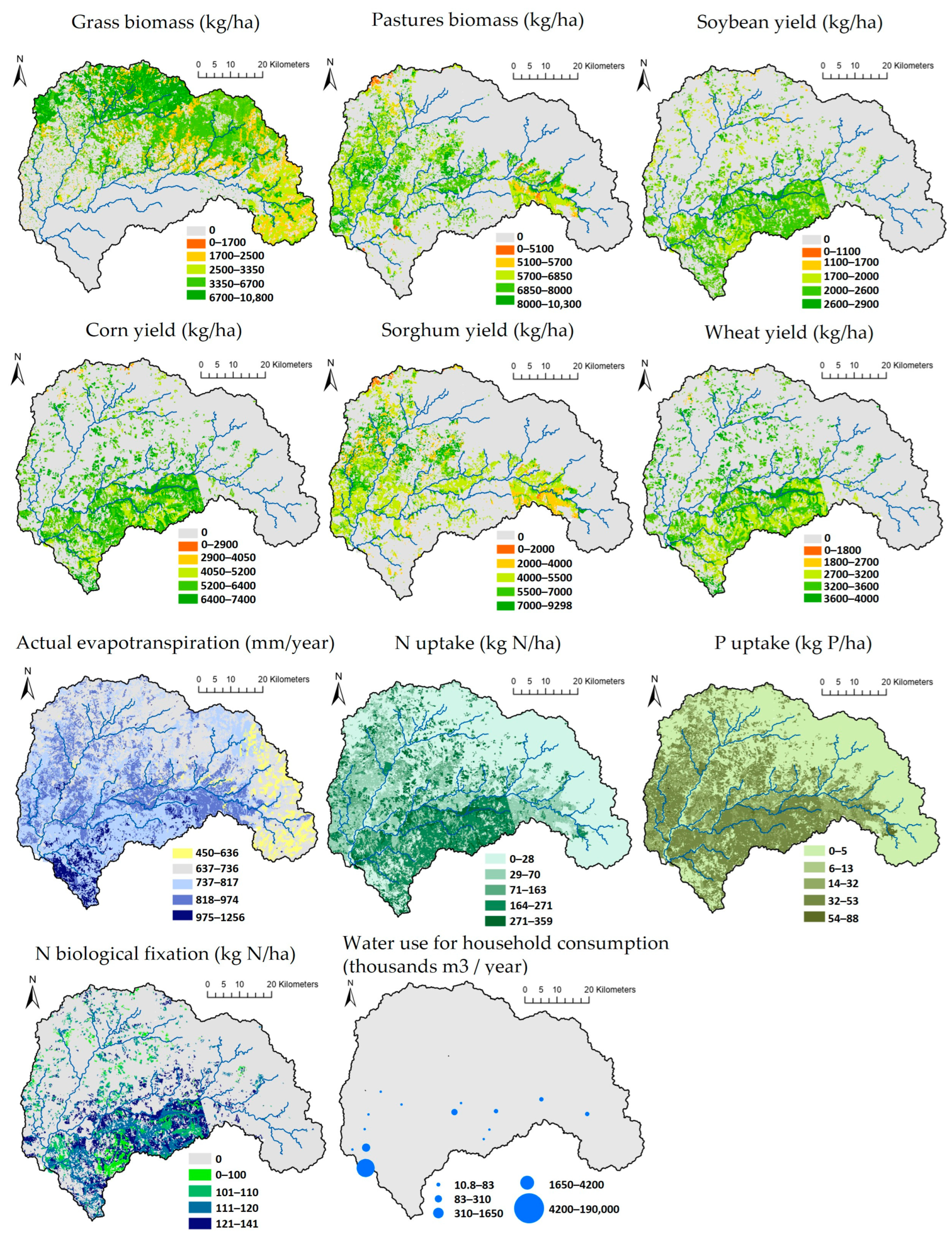 Grass and pasture biomass (kg/ha—dry weight): Although the values for the basin average are consistent with national accounts values (see Section Model Performance Evaluation), the spatial distribution of these values was obtained through SWAT. They represent the total aboveground and root biomass available in grasses and pastures. The results are then multiplied by the harvest index to estimate the biomass consumed by livestock. A plant growth model, a simplified version of the Environmental Policy Integrated Climate (EPIC) model, is employed to estimate potential biomass under ideal conditions based on intercepted energy and the plant’s efficiency in converting energy to biomass [