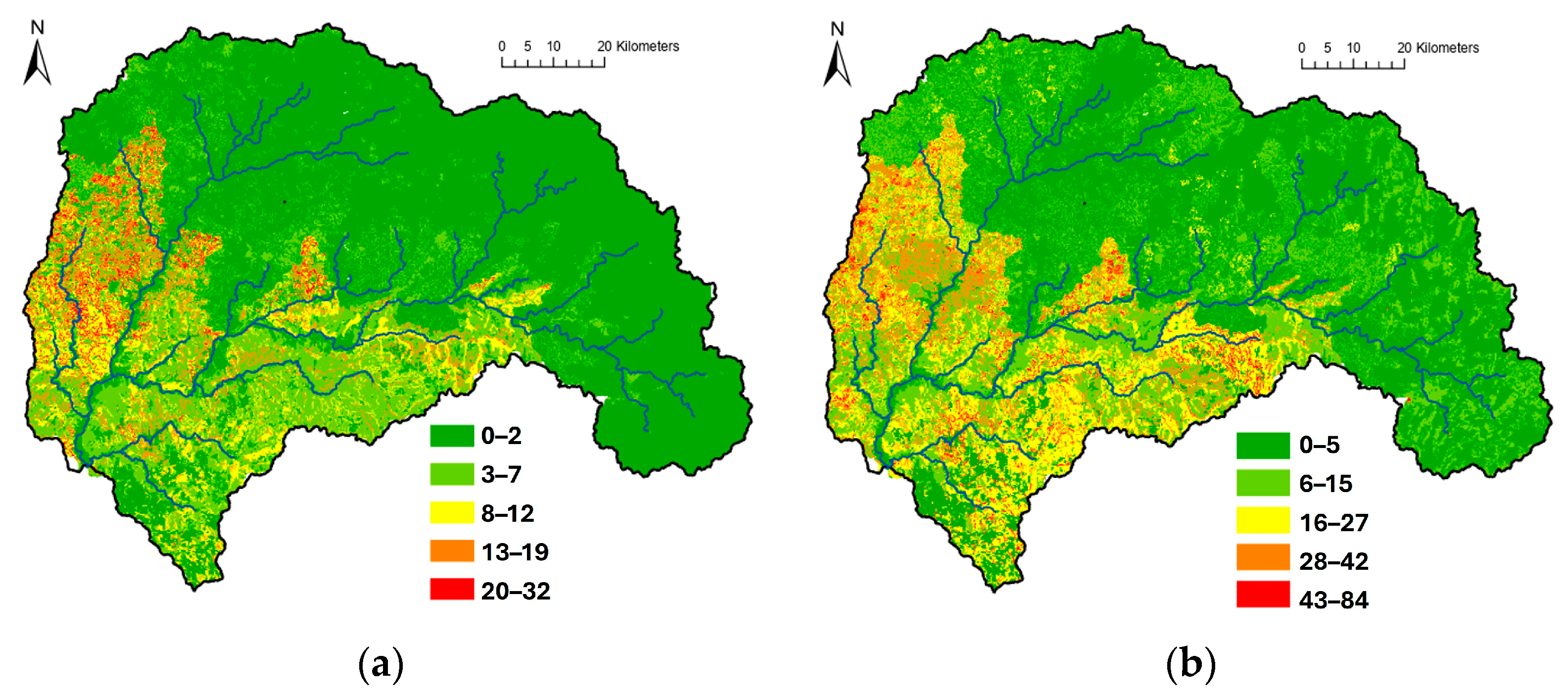 55]) are not captured in the model. These dynamics may influence nutrient export estimates, particularly in areas undergoing rapid agricultural intensification. Updating land-use inputs using more recent remote sensing products represents an important avenue for future research.