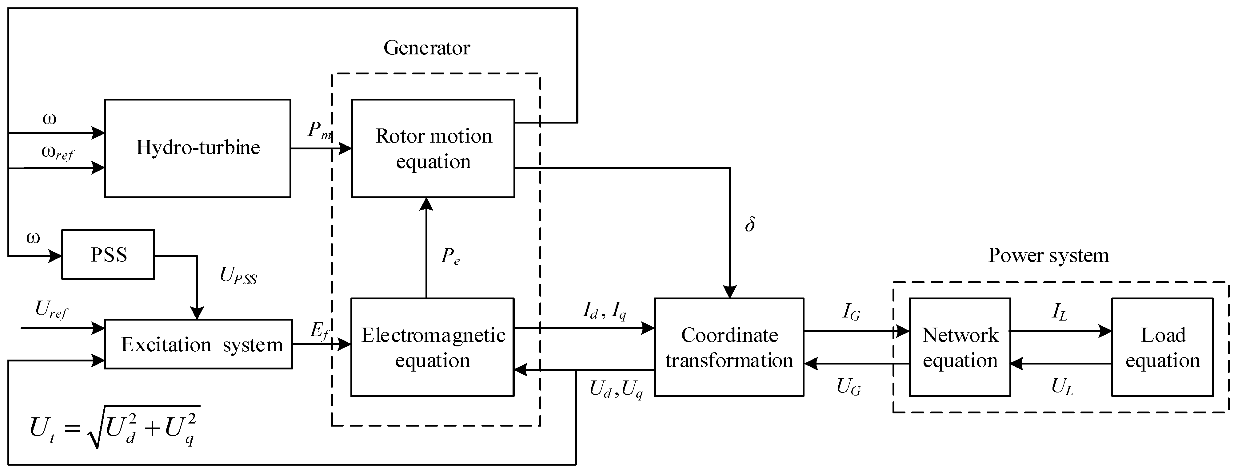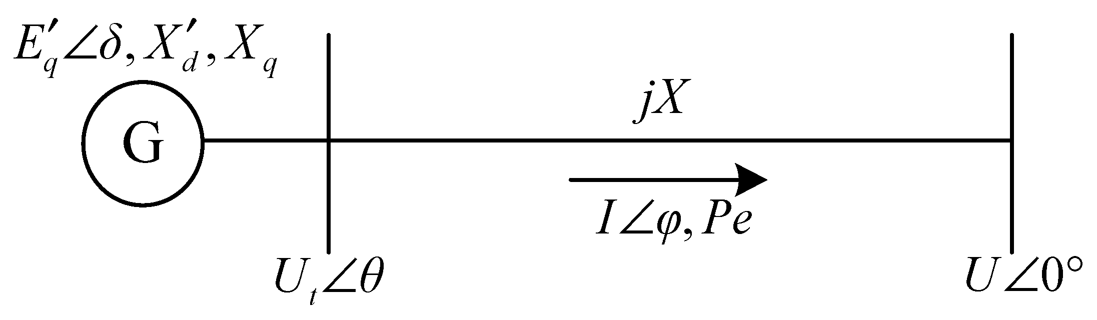 29]. It should be noted that the model established in this paper is based on the assumption of a power system connected to an infinite-bus power system, implying that its voltage magnitude and frequency are constant and unaffected by the dynamics of the studied subsystem. This assumption simplifies the analysis of the network side and focuses mainly on the dynamics of the hydropower unit itself.