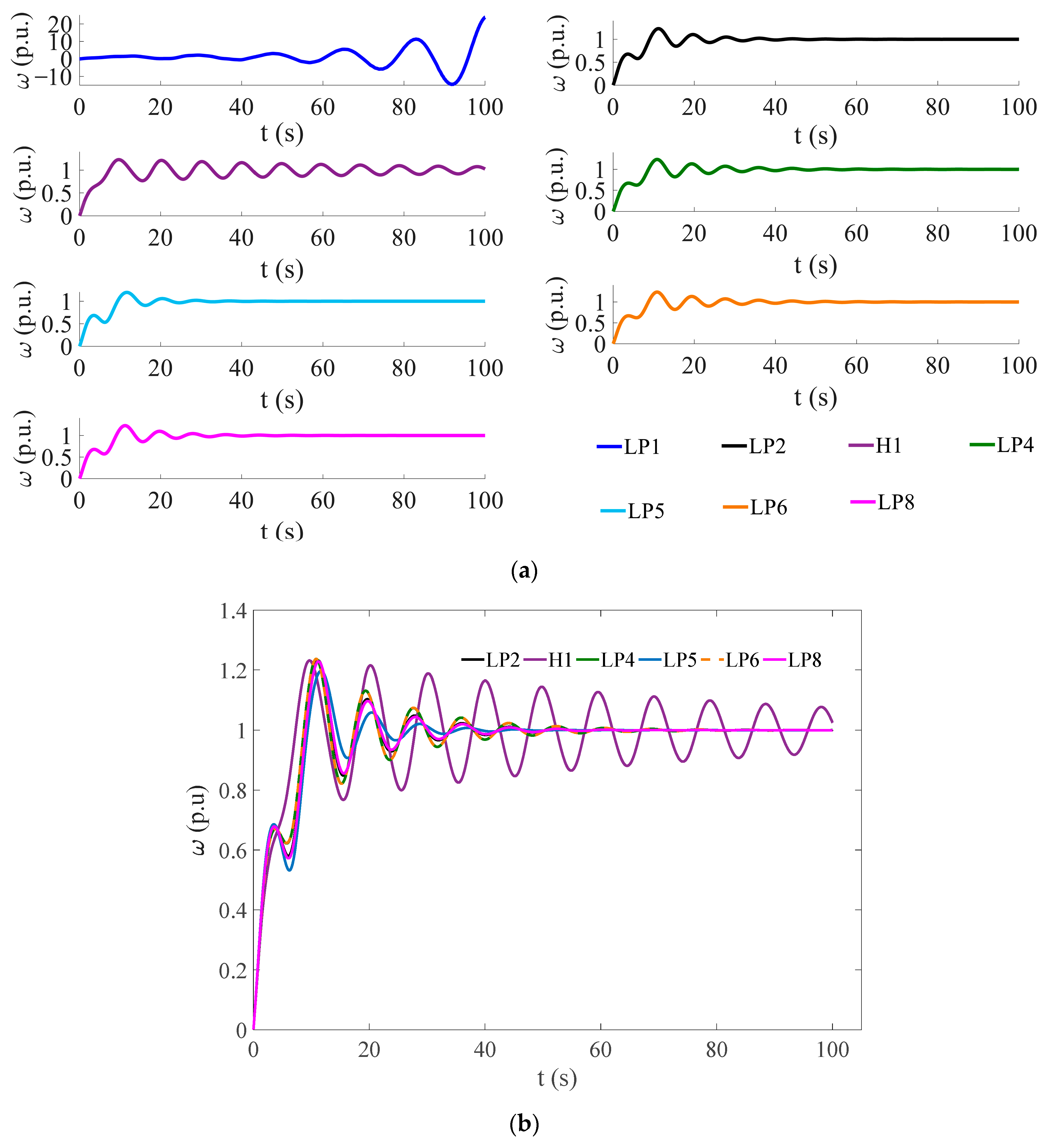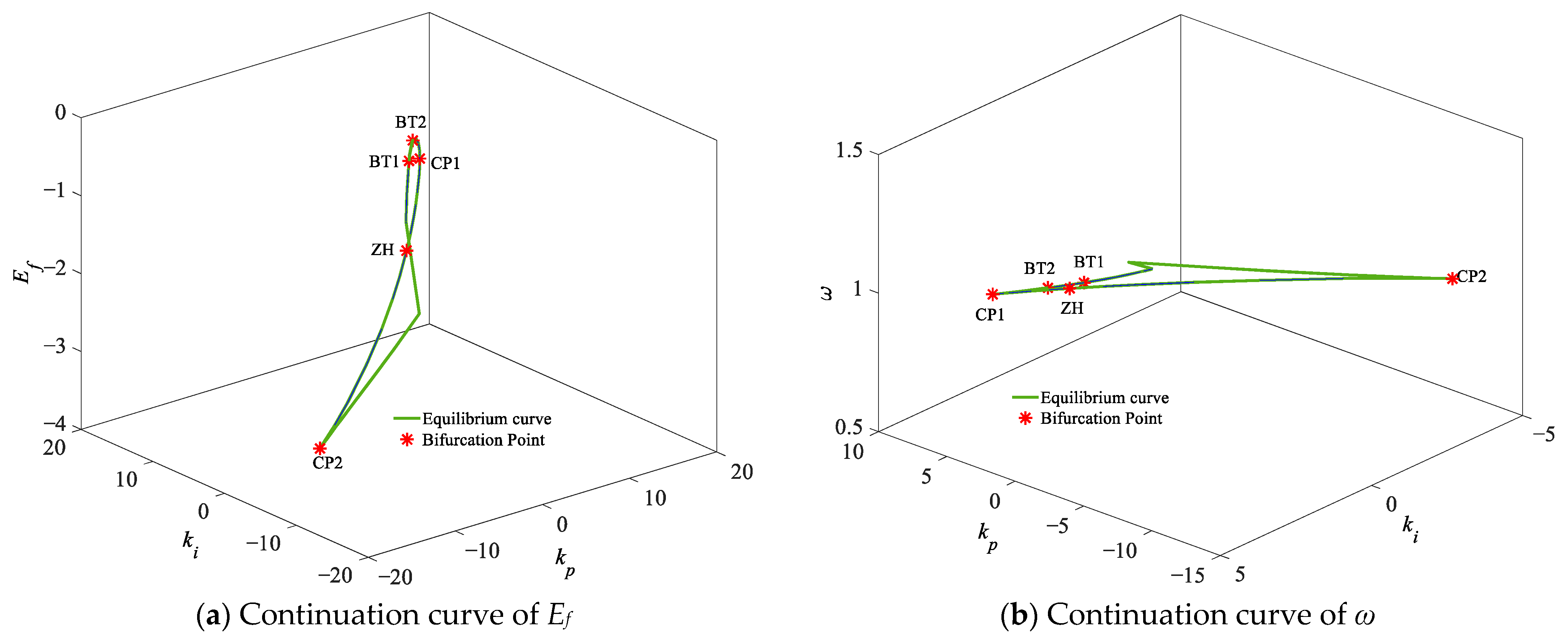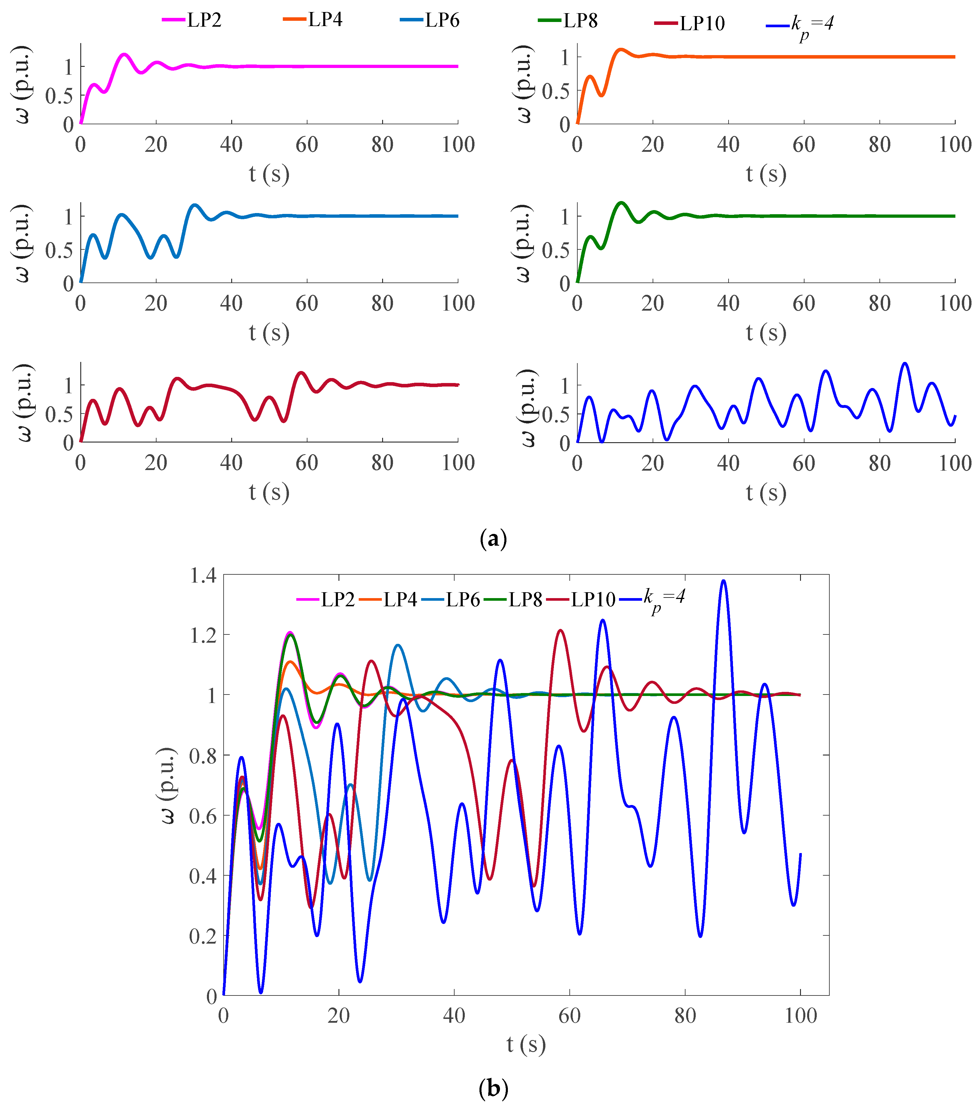 HPGS encounters five limit points with the variation in kp, which delineates the stability boundary of kp. The system achieves asymptotic stability when kp is less than 0.891. It exhibits damp oscillation characteristics for kp values between 0.891 and 2.154. The system becomes unstable once kp exceeds 2.467. Time-domain analysis at kp = 4 verifies this instability characteristic. Some modes correspond to ultra-low-frequency oscillations with frequencies close to 0.02 Hz, while the rest are typical low-frequency oscillations in the range of 0.1–2.5 Hz. Prolonged operation under such conditions is prone to causing unit fatigue and degradation of power quality. Codimension-2 bifurcation analysis initiated from LP2 reveals that ki and kp increase synchronously, and the effective ki values at all bifurcation points are higher than 0.891. In engineering practice, kp should be set below 0.891, while the adaptability between kp and ki should be considered. This ensures that the parameters stay away from bifurcation points such as BT, ZH, and CP.
