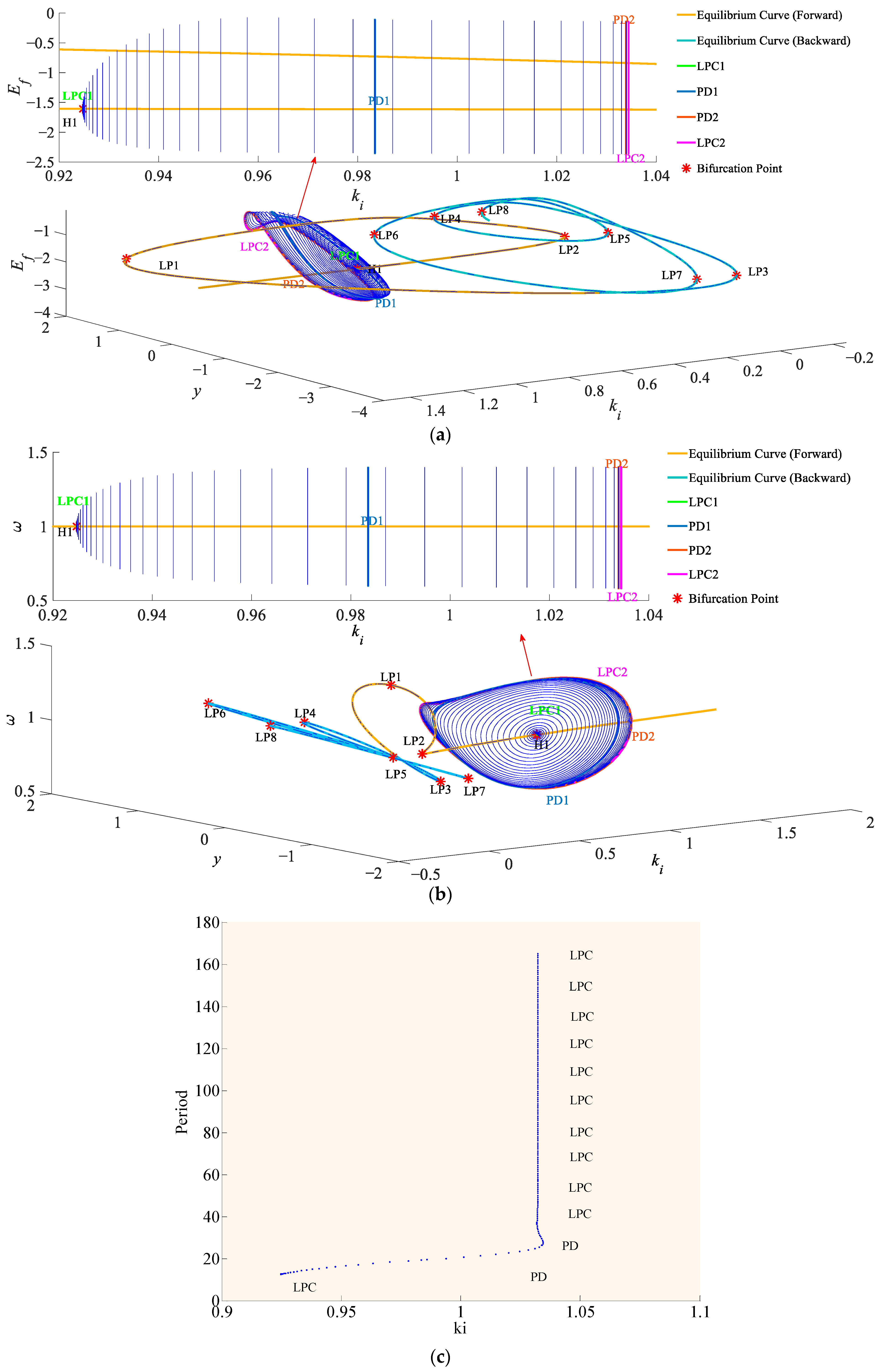 Six limit points and one supercritical Hopf bifurcation (ki = 0.925) are identified with the variation in ki. H1 induces a stable limit cycle, causing the system to lose stability and exhibit sustained oscillations in the vicinity of this point. LP1 (ki = 1.303) serves as the critical point of growing oscillations, and the system loses stability directly when parameters approach this value. Oscillation mode analysis demonstrates that low-frequency oscillations around 0.57 Hz with a damping ratio of approximately 0.2 and ultra-low-frequency oscillations in the range of 0.02–0.07 Hz exist at all bifurcation points. Further continuation analysis reveals the presence of LPC and PD in the neighborhood of H1. When ki > 0.925, the dynamic behavior of the system tends toward complex instability. Codimension-2 bifurcation analysis identifies one CP and one ZH, which delineates the high-risk parameter intervals under the synergistic variation in parameters. It is necessary to strictly restrict ki to values below 0.925 and keep it far from 1.303.