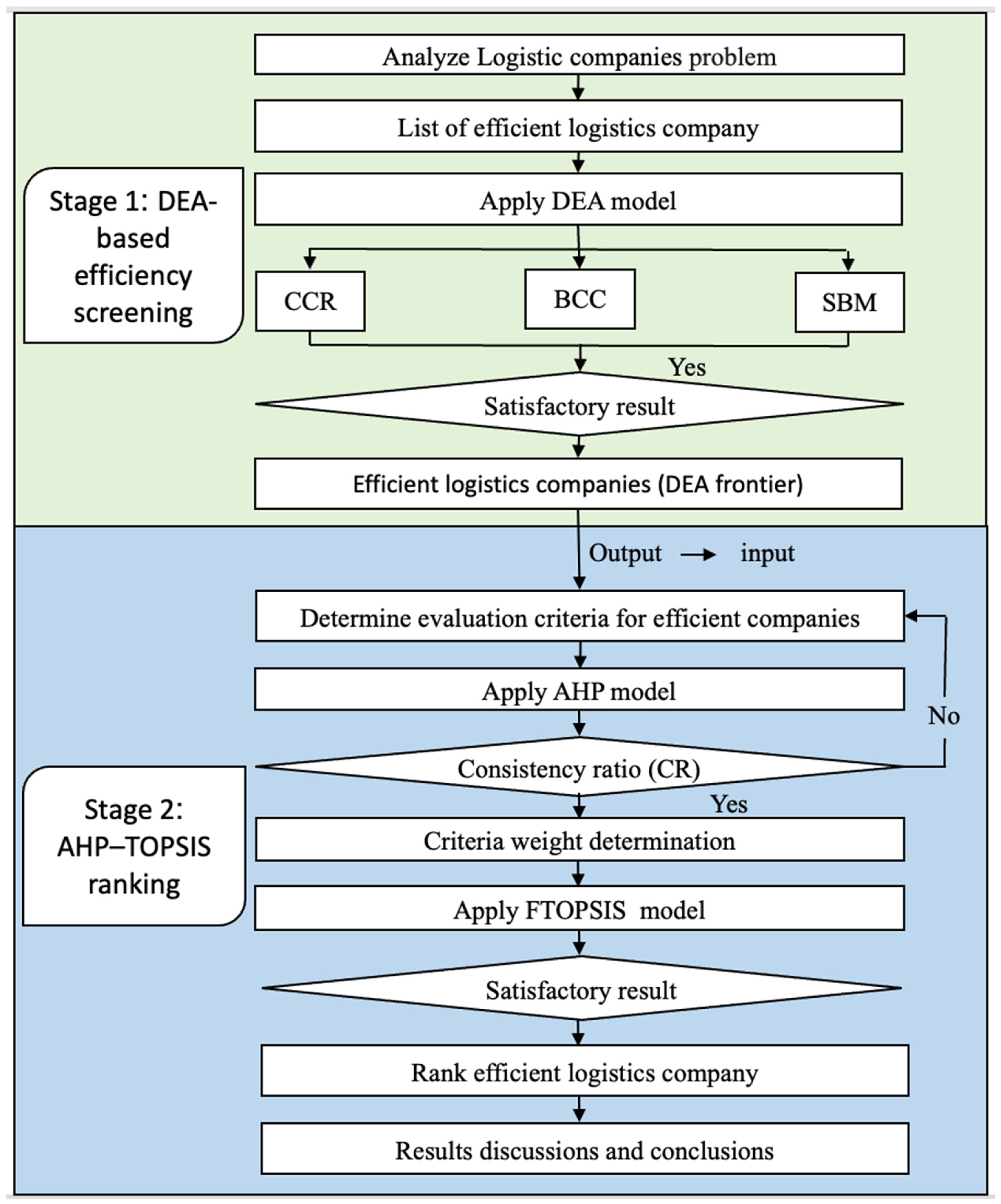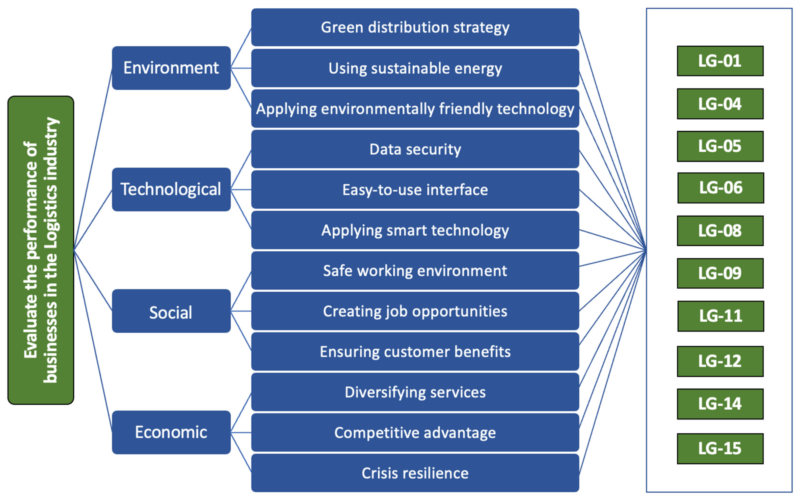 Figure 1. These criteria include factors related to the environment, society, economy, and technology, aiming to provide more insight into the performance of the best-performing group of enterprises according to the results of the first layer of analysis. The addition of these criteria aims to overcome the limitations of using only DEA models, helping to comprehensively evaluate and consider more multidimensional aspects of business operations. This also illustrates the increasing importance of social and environmental considerations in contemporary supply chain and logistics management. This motivates the development of the second step of the proposed approach, which involves a multi-criteria evaluation procedure. This provides a strong motivation to further examine relevant factors and support informed decision-making for the long-term sustainable development of logistics enterprises.