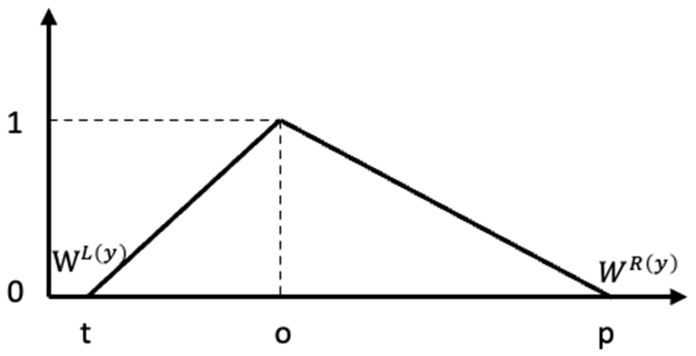 51]. Accordingly, the triangular fuzzy number (TFN) is defined by the triple (t, o, p) where