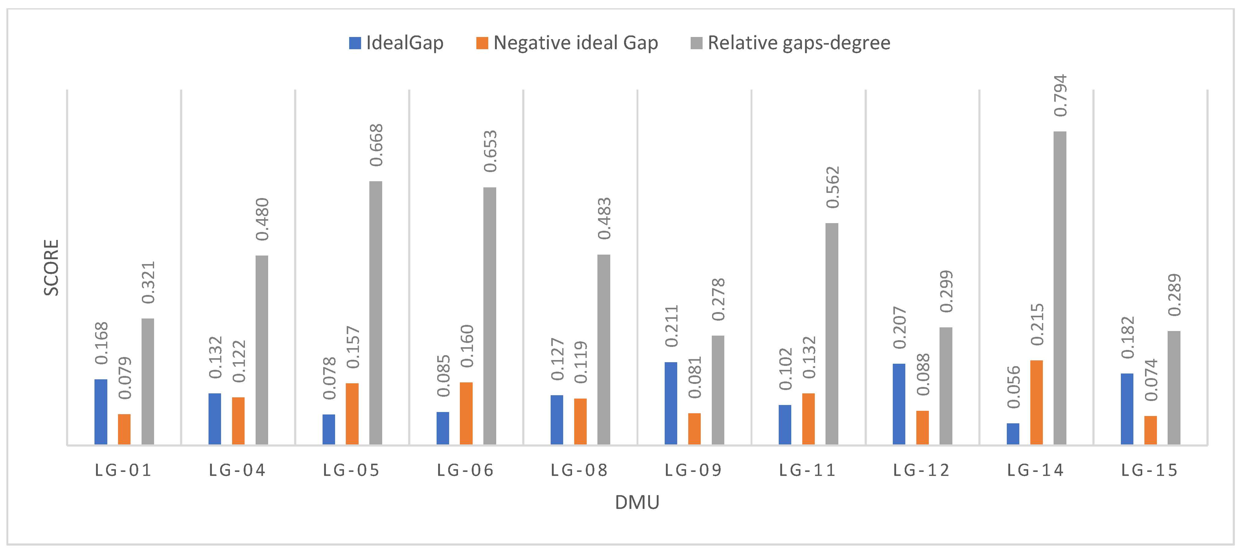 Figure 5 show that the logistics units have clear differences in performance. In particular, LG-14 exhibits the highest performance, characterized by the lowest Ideal Gap and the highest Negative Ideal Gap, indicating that it is the most efficient unit, close to the ideal solution and far from the inefficient condition. Next, LG-05 and LG-06 also show good performance, with a significant gap from the inefficient state. In contrast, units such as LG-01 and LG-09 exhibit lower relative gap degrees, indicating that further improvements are required to enhance their efficiency compared to the leading units. These results provide a strategic perspective for optimizing the operations of logistics units, thereby contributing to improvements in overall industry efficiency.