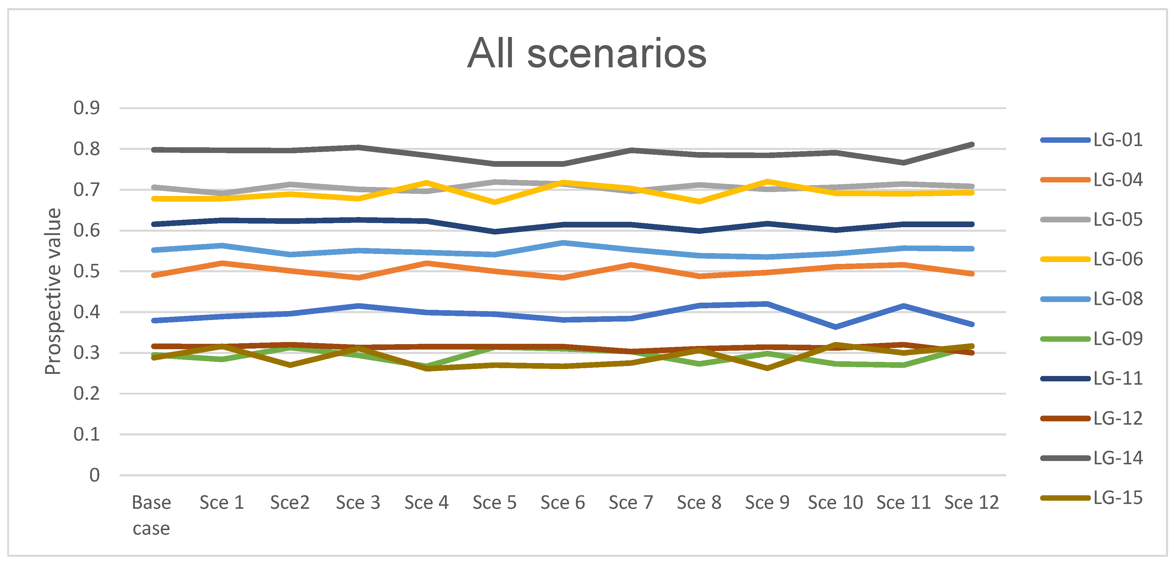Figure 6 visually illustrates the ranking variations in the alternatives across all weighting scenarios. The curve representing LG-05 remains consistently positioned at the top, reinforcing the conclusion that it is the optimal alternative in every case. Conversely, the curve of LG-09 generally stays at the bottom, indicating stable and consistently weak performance across scenarios. Alternatives such as LG-01, LG-04, and LG-08 exhibit minor fluctuations; however, these do not result in any substantial reversal in their overall ranking positions. Accordingly, the sensitivity analysis indicates that the proposed model demonstrates a high degree of stability, and the final ranking decisions are not overly dependent on any single weighting configuration.